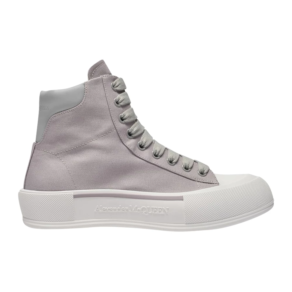 Gå ut i Beige Canvas Deck High-top joggesko til sommeren 2022 fra Alexander McQueen. Følelsen er nautisk og vil gå bra med veldig uformell utseende. Bruk din med Jean Shorts og en overdimensjonert jakke. Farge: Gris – 1497 Cool Grey/Dove Grey. Hovedmateriale: lerret. Såle: gummi. Fôr: lær. Lukking: Topplisser. Tåform: rund.