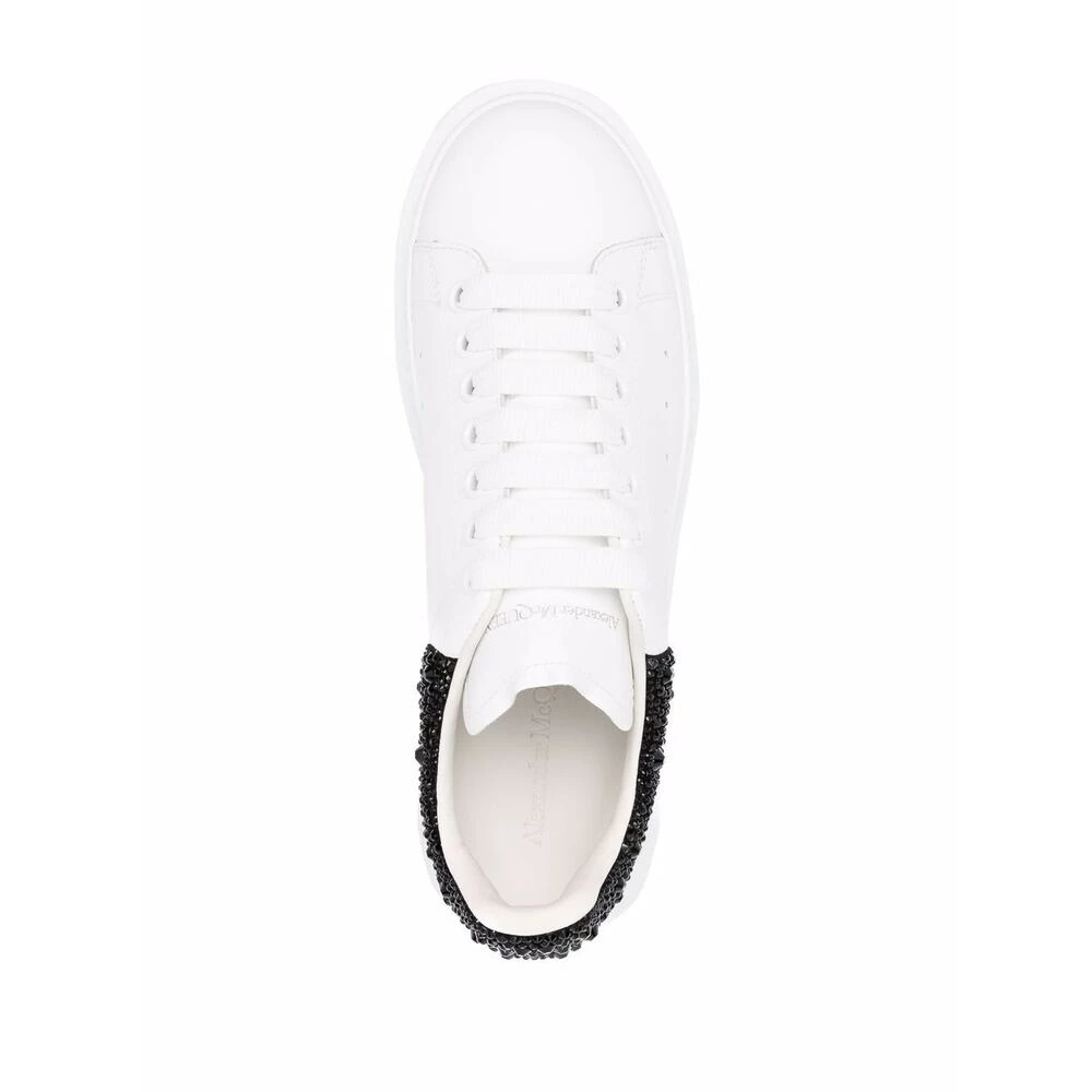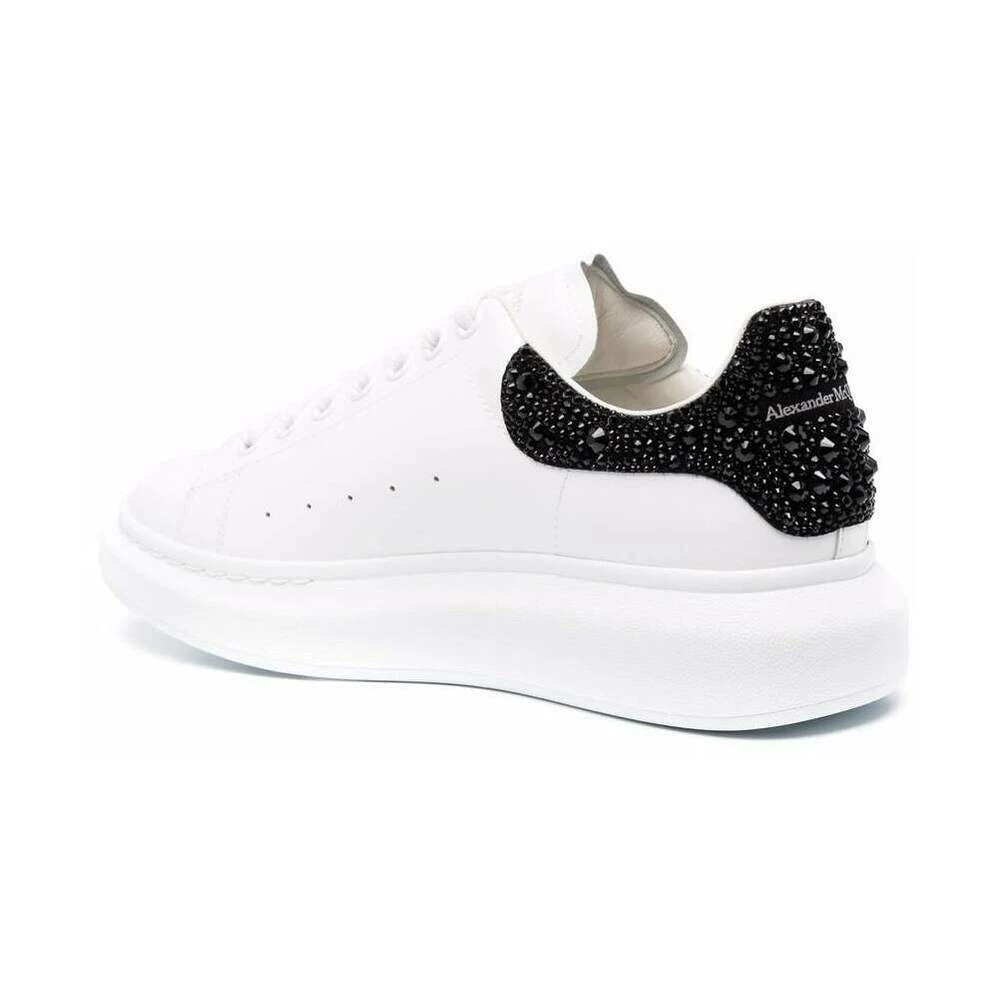 Hvite sneakers fra Alexander McQueen. Dette snøreparet er laget av kalveskinn og har en sølvfarget logodetalj på pløsen, logoapplikasjon pyntet med svarte rhinestones, hvit gummisåle og utskiftbare lisser.
