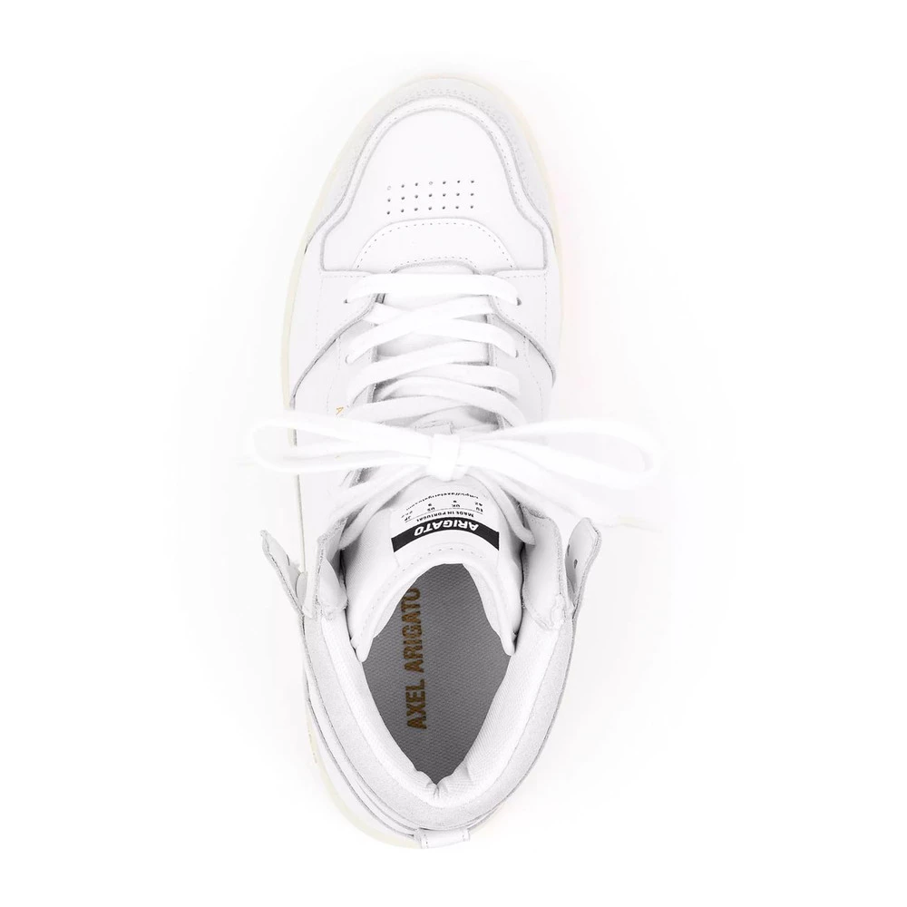 Axel Arigato joggesko hvite terninger hi-top joggesko med gullfarget logobokstaver, panelet design, ankellengde, perforeringsdetaljer ved tå, rund tå, frontfjæring foran, logo lapp på tungen, flat gummisåle