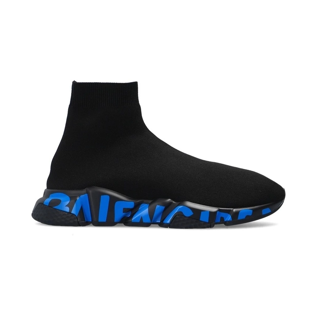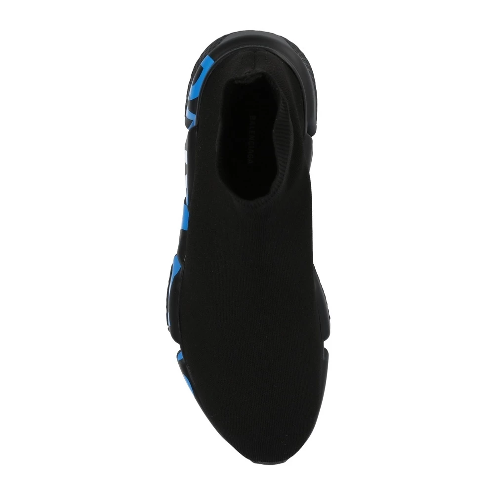 Black ‘Speed’ sneakers fra Balenciaga. Med stretch strikke øvre med sokk-lignende krage. Blå logo print på den svarte gummisåle.