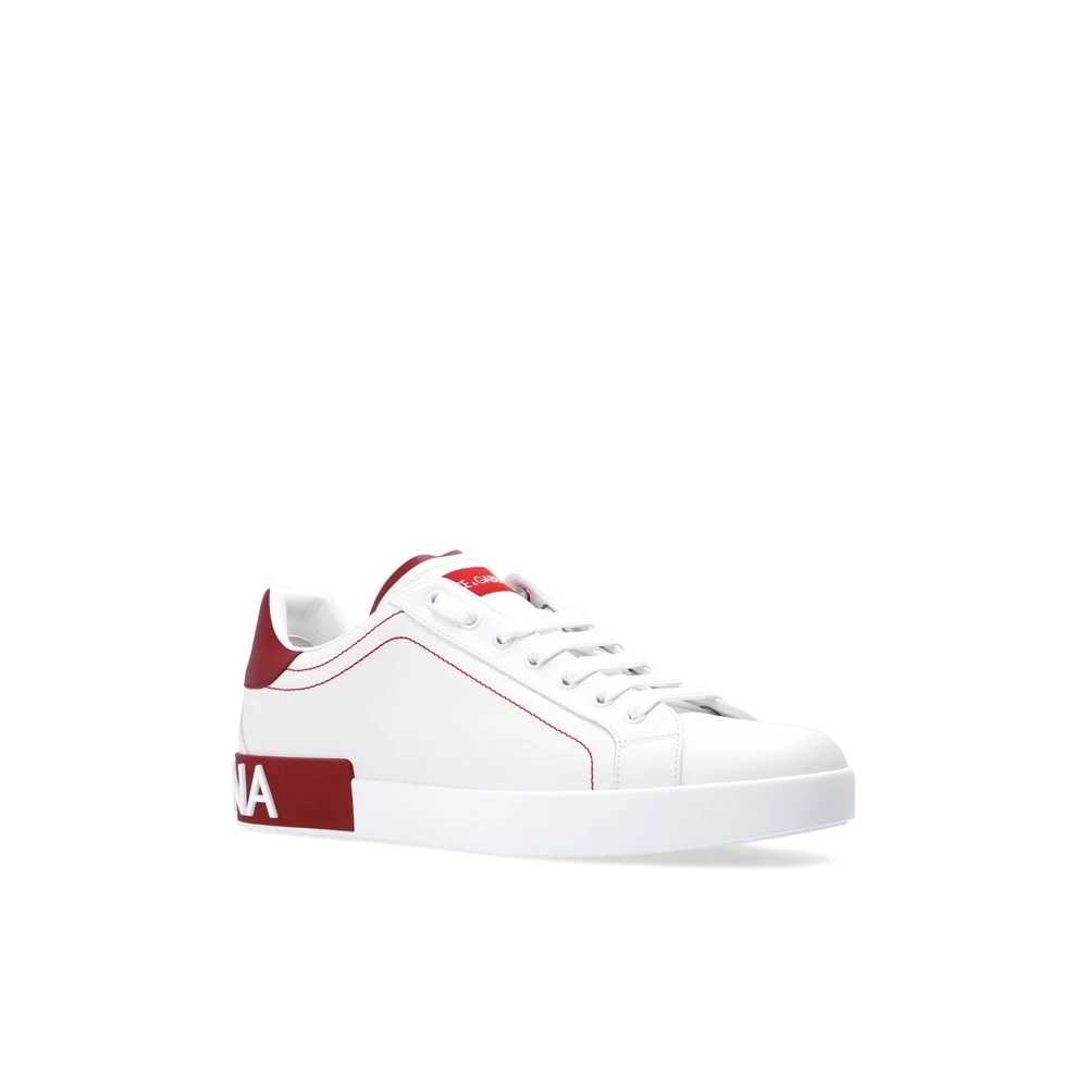 White and Maroon ‘Portofino’ blonder-joggesko fra Dolce Gabbana. Sportslig en taktil logo-applikasjon, sitter dette kalveskinnlagde paret på en strukturert gummisåle.