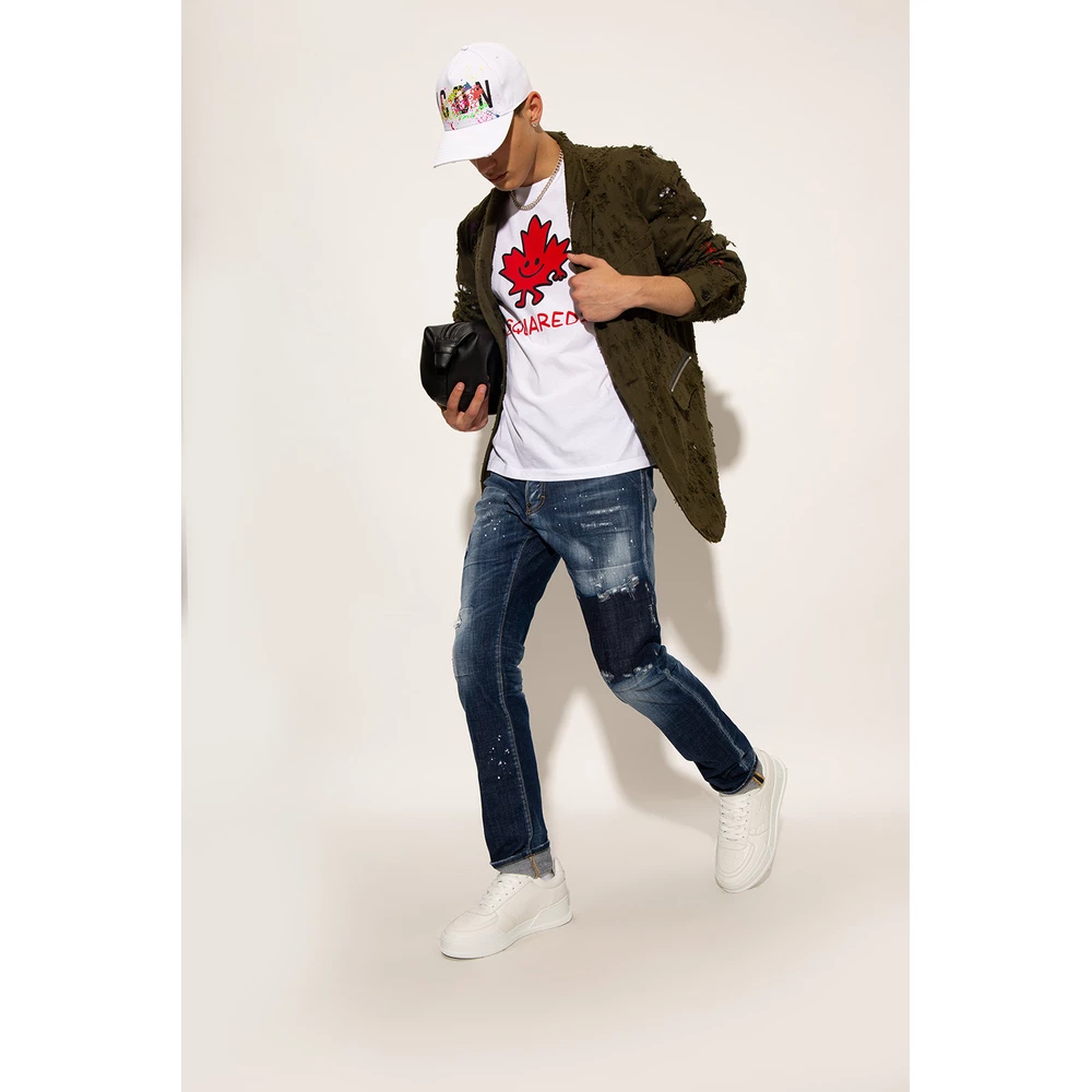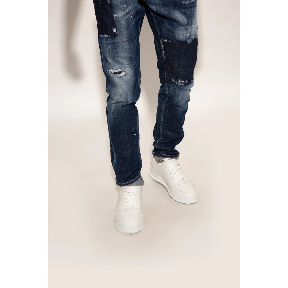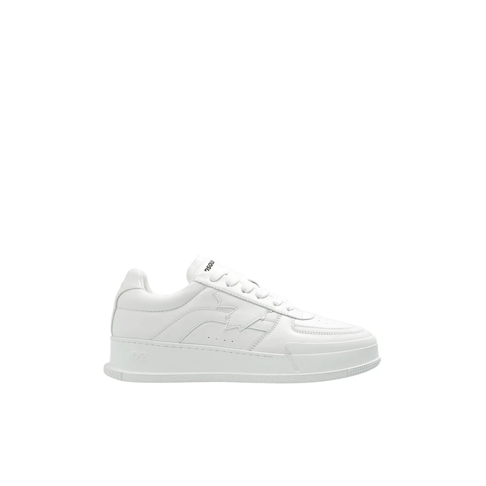 Hvite ‘kanadiske’ joggesko fra Dsquared2. Denne snøremodellen er laget av skinn, og sitter på en hvit gummisåle og har en perforert tå, logo-detaljering og merkets signatur Maple Leaf-motiv. Svarte byttbare skolisser inkludert.