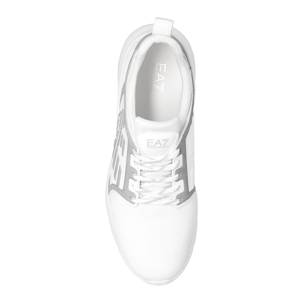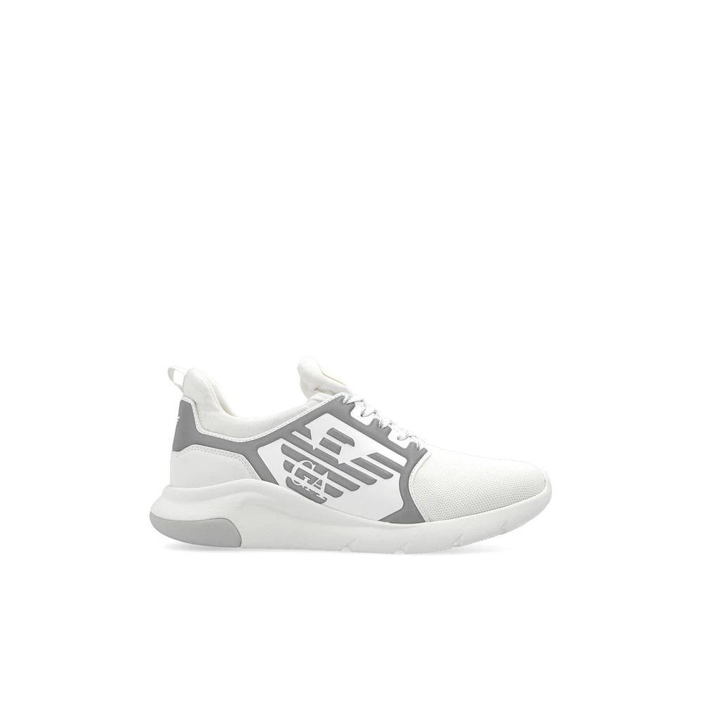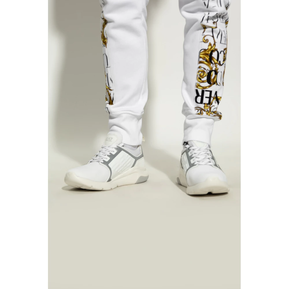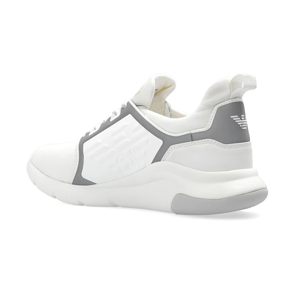 Hvite og grå joggesko fra EA7 Emporio Armani. Denne snøremodellen er laget av sporty materiale og trimmet med syntetiske overlegg, og sitter på en hvit og grå gummisåle og viser reflekterende elementer, merket merket Eagle-logoen på siden og logodetaljer på tungen og hælbenken.