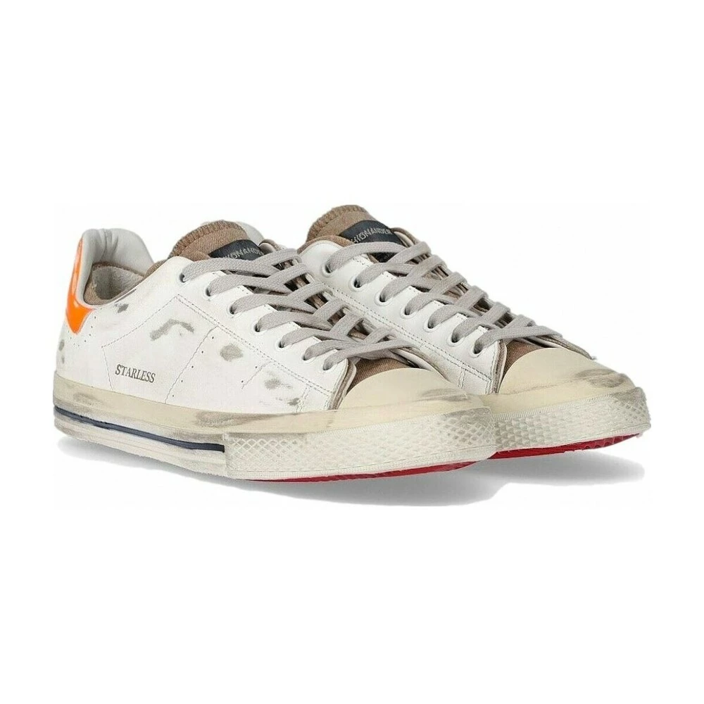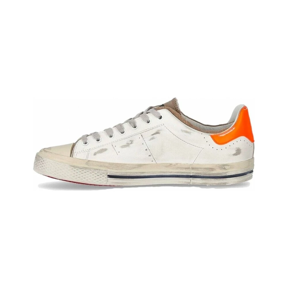 Stjerneløs lav hiverløs sko i myk hvit hud brukt med innsettinger på den brune lerrets tungen. Detalj Halonera i oransje fluor, bomullsspiller og lærmal. Tå og gummisåle, høyde 3 cm. Artisanal produksjon i Italia