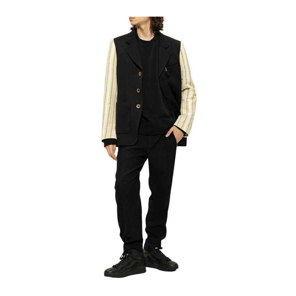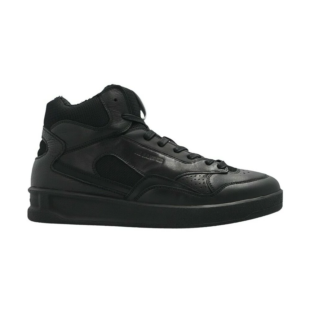 Svarte joggesko fra Jil Sander. Denne snøremodellen er laget av skinn, og sitter på en svart gummisåle og har stoffoverlegg, dekorative perforeringer og en preget logo på siden.