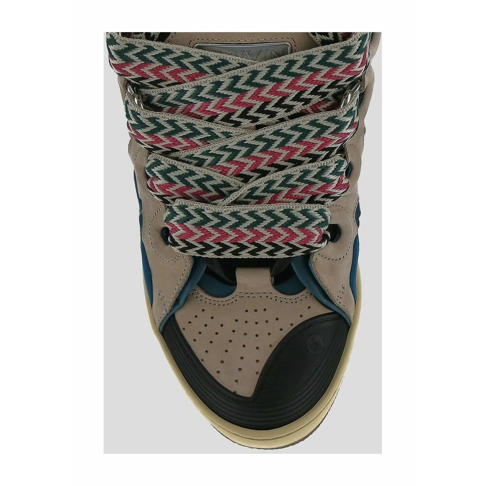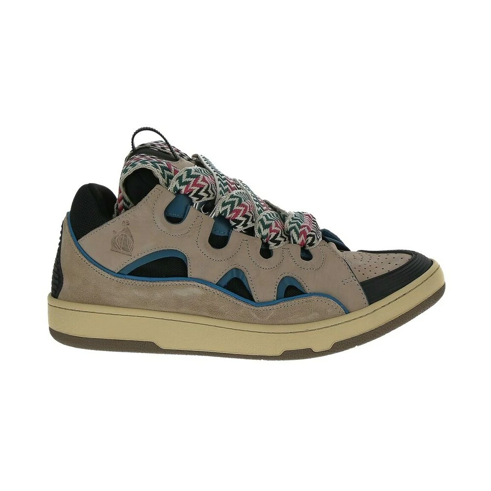 Beige, svart og blå ‘fortauskant’ joggesko fra Lanvin. Dette paret er inspirert av 90-tallet, og har en overdimensjonert semsket øvre med stofftrims, dette paret er komplett med dekorative flerfargede snøringer, tunge med en logo-applikasjon, perforeringer, preget logo og gummisåle i beige og krem.