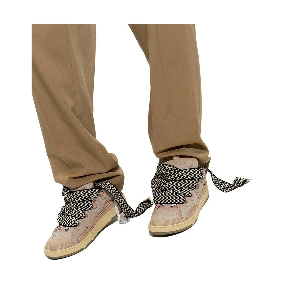 Rosa ‘Curb’ joggesko fra Lanvin. Denne blondermodellen er laget av kalveskinn og stoff, og sitter på en grå gummisåle og har logo-detaljering, gummiinnsatser og brede snøringer i hvitt og svart.