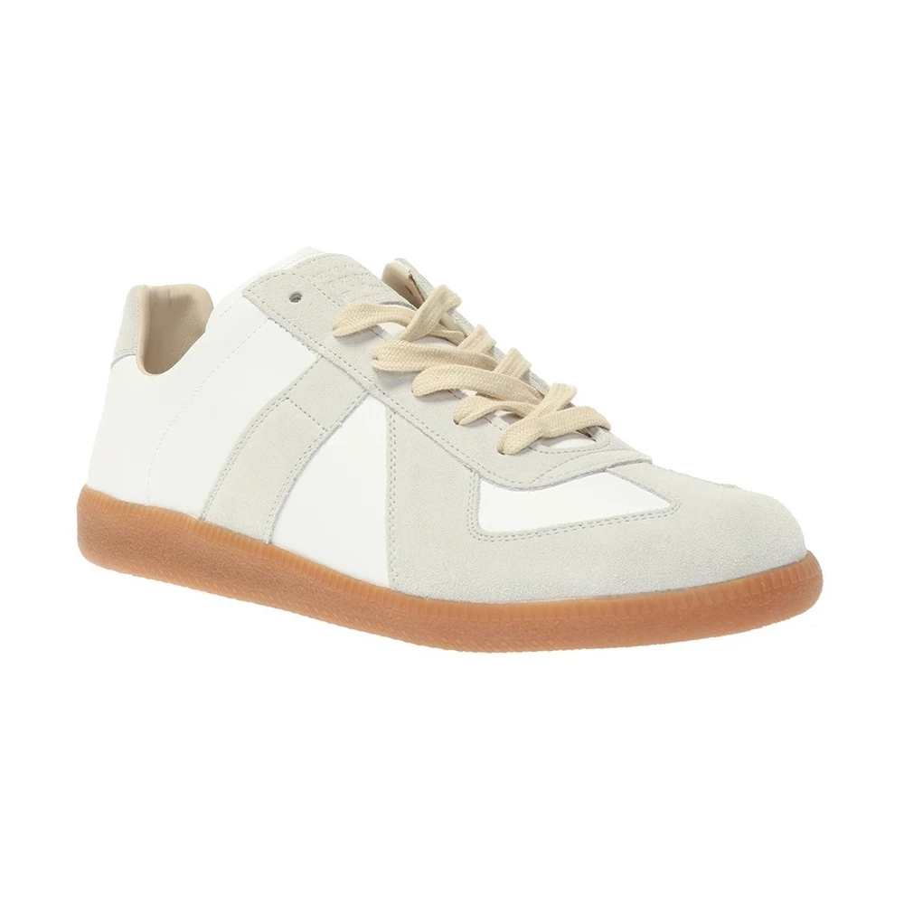White and Grey Lace-Up `Replica` joggesko fra Maison Margiela. Laget av glatt skinn og semsket skinn. Funksjon logo-faboset lapp på øvre fron og beige gummisåle ved basen.