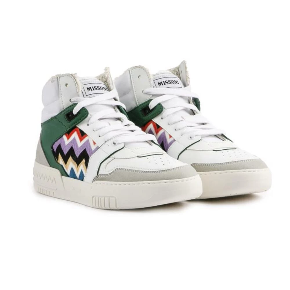 Womens White Missoni Basket Hi Trainers, produsert med syntetisk og en gummisåle. Med: øvre i maisbase. Apple base.ReBotilia, innersåle i resirkulert skum, yttersåle i biogum, foring i bomull og størrelse opp hvis det er mellom størrelser.