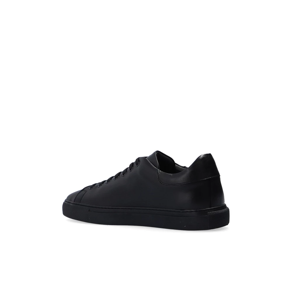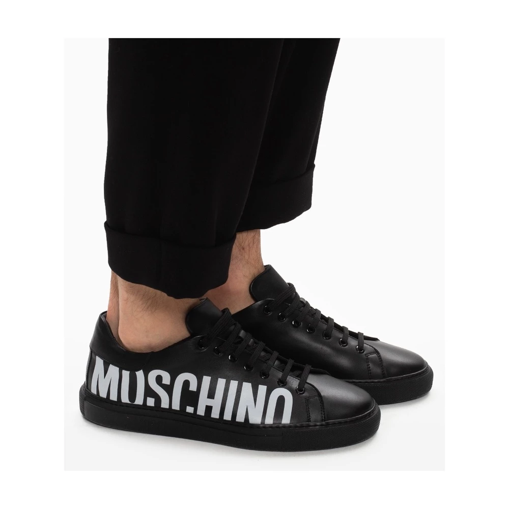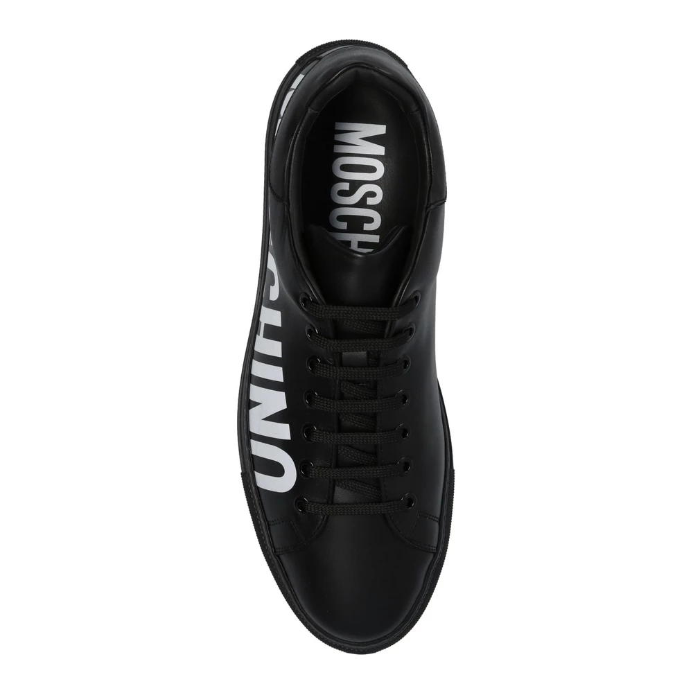 Svarte joggesko fra Moschino. Denne snøremodellen er laget av skinn, og har en hvit logo-trykk og svart gummisåle.