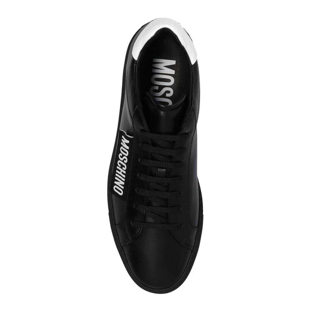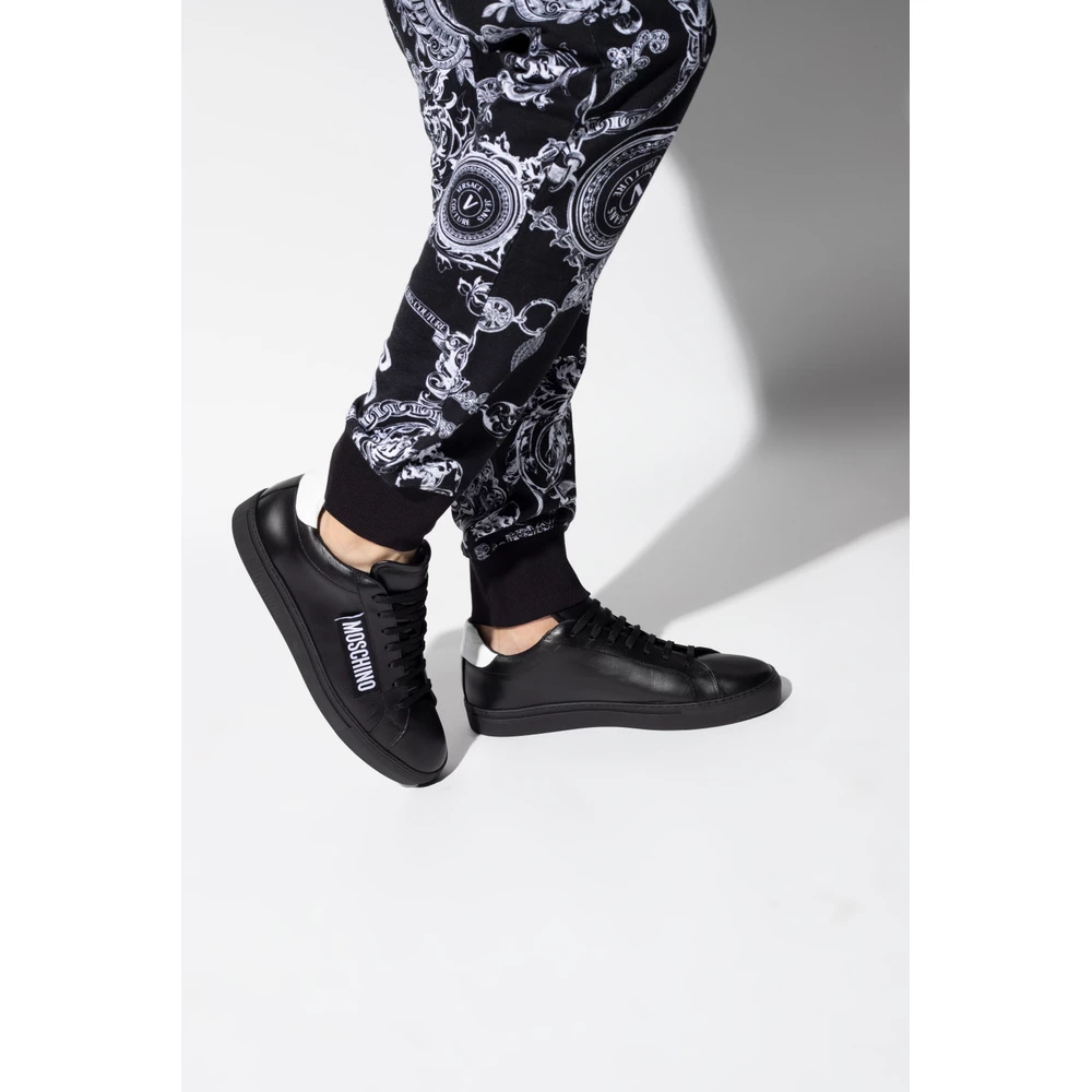 Svart og hvite joggesko fra Moschino. Laget av lær. Dette blonderparet hviler på en svart gummisåle, og er beriket av preget og brodert logodetaljer.