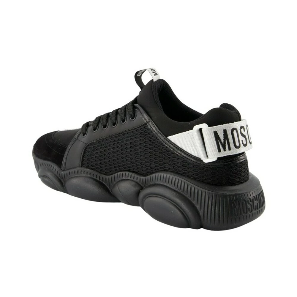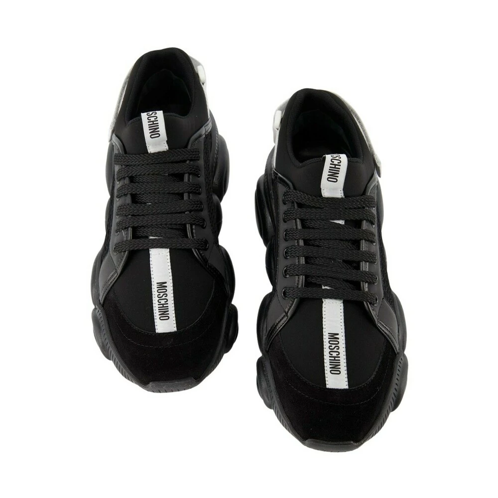Svart og hvite joggesko fra Moschino. Denne snÞremodellen er designet med en panelkonstruksjon, og sitter pÄ en svart gummisÄle i form av merkets signatur bamse og har en logo-lapp pÄ fronten og en logo-embroidered borrelÄs stropp pÄ baksiden.