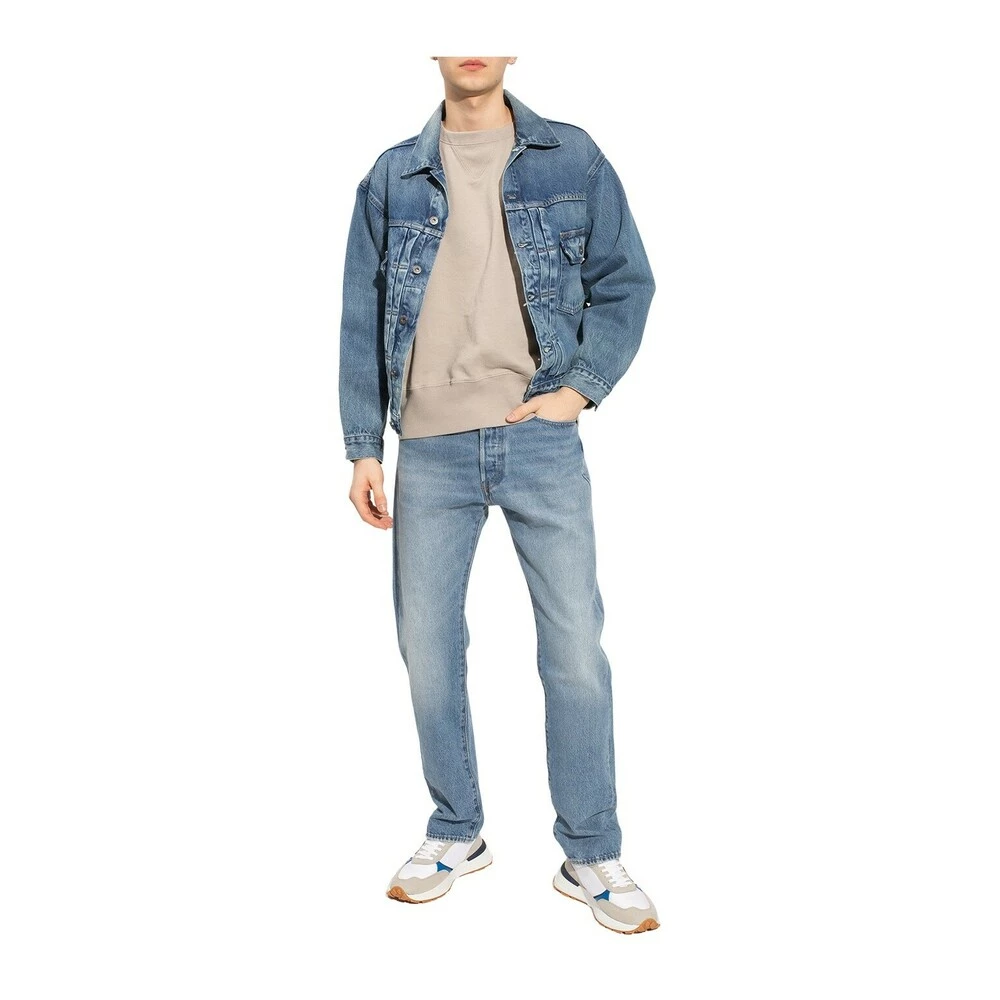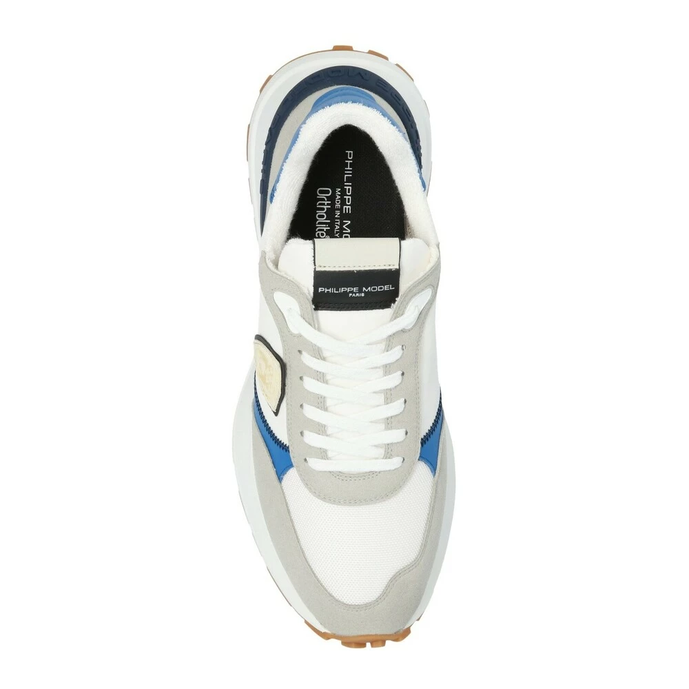 Hvite, blå og grå ‘antibes lave’ joggesko fra Philippe -modellen. Denne blondermodellen er ferdig med semsket skinn, og har sølvfarget logo som detaljerer på fronten, en blå lapp på baksiden og en hvit, brun og marineblå gummisåle ved basen.