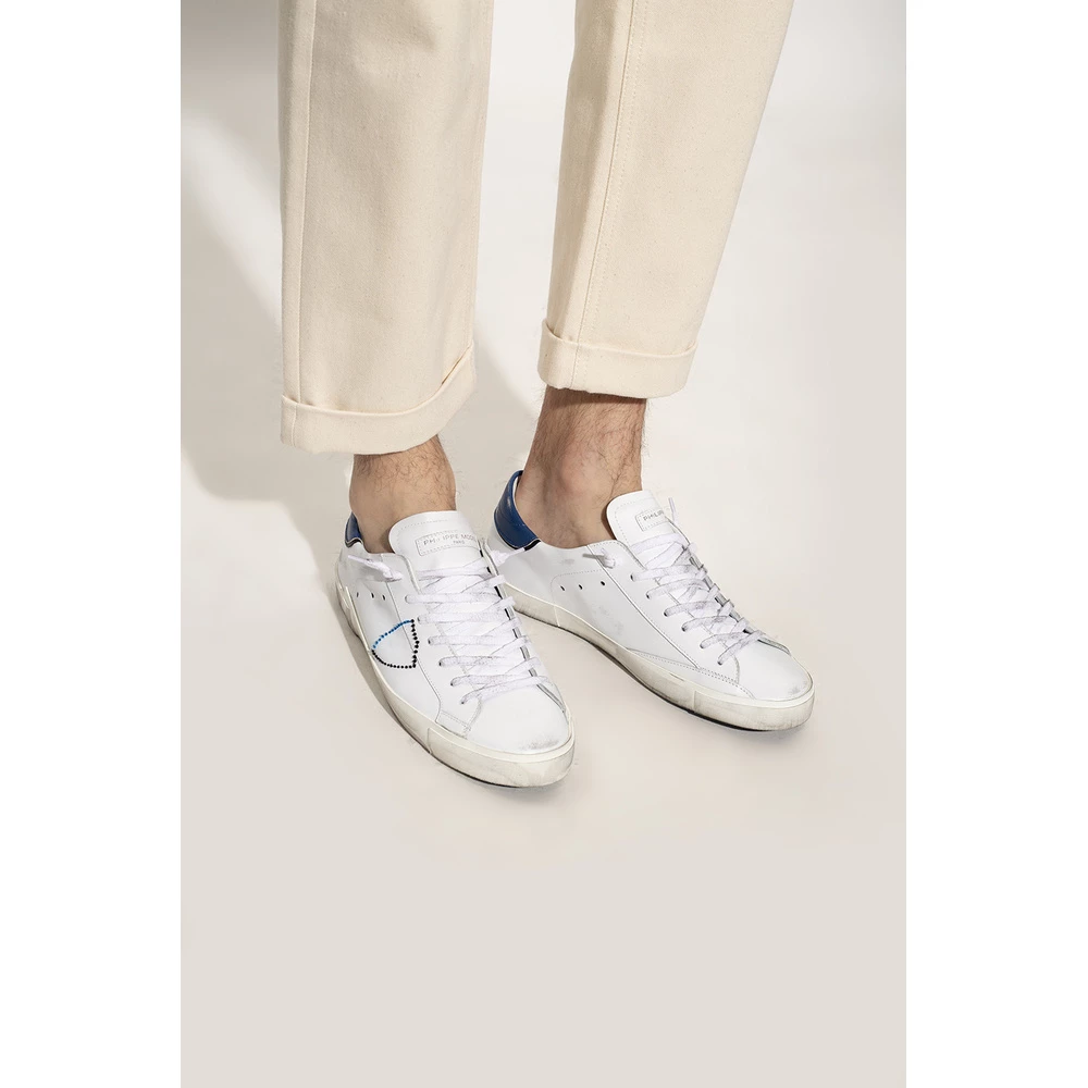 White ‘PRSX’ joggesko fra Philippe -modellen. Dette blonderparet er laget av skinn, og har et brodert mønster, blå hælbenk trykt med en sølvfarget logo og blå gummisåle.