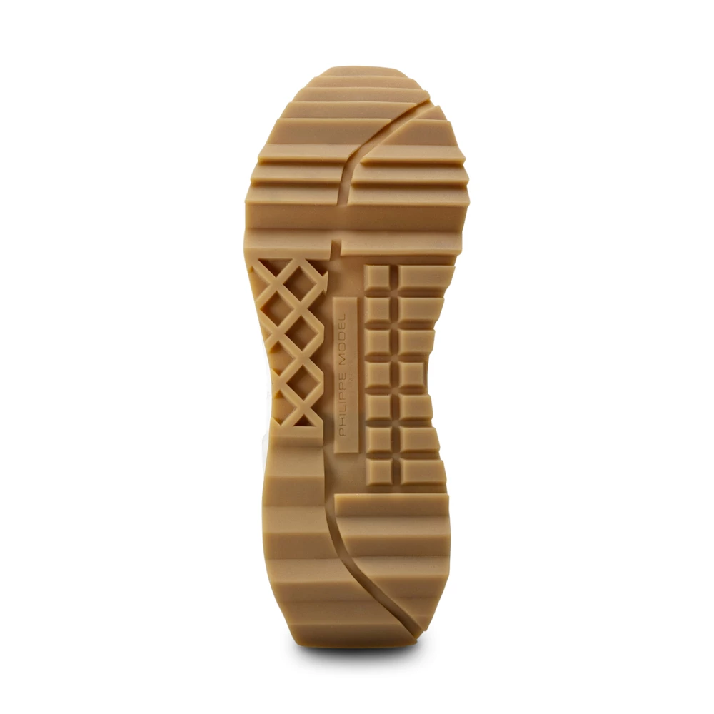 Hvite og grå `la rue mondial` joggesko fra Philippe -modellen. Denne snøremodellen er laget av skinn og semsket skinn med nylon og netting overlegg og beige såle laget av polyuretanskum med en gjennomsiktig TPU -pute.