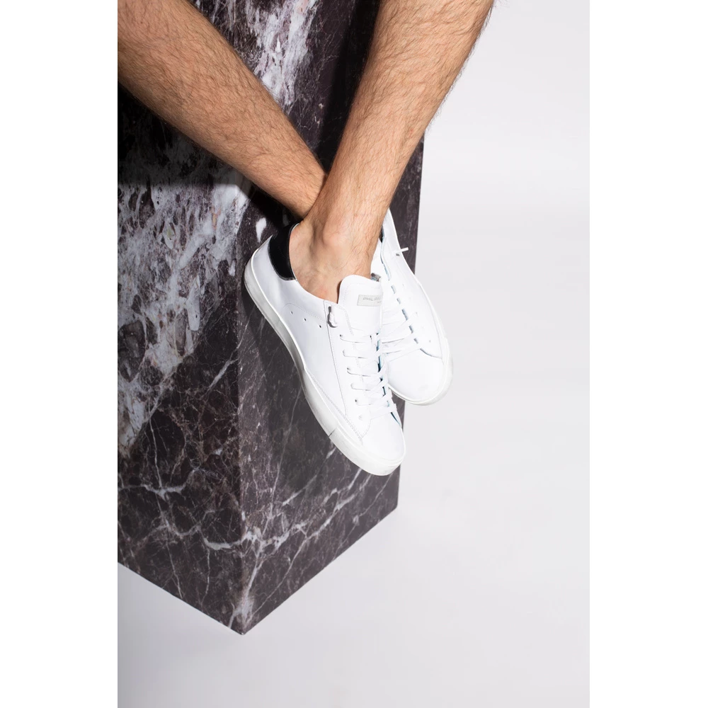 Hvite joggesko fra Philippe -modellen. Denne blonderdesignet er laget av skinn, og har en logo-lapp, kremgummi og en slitt effekt.