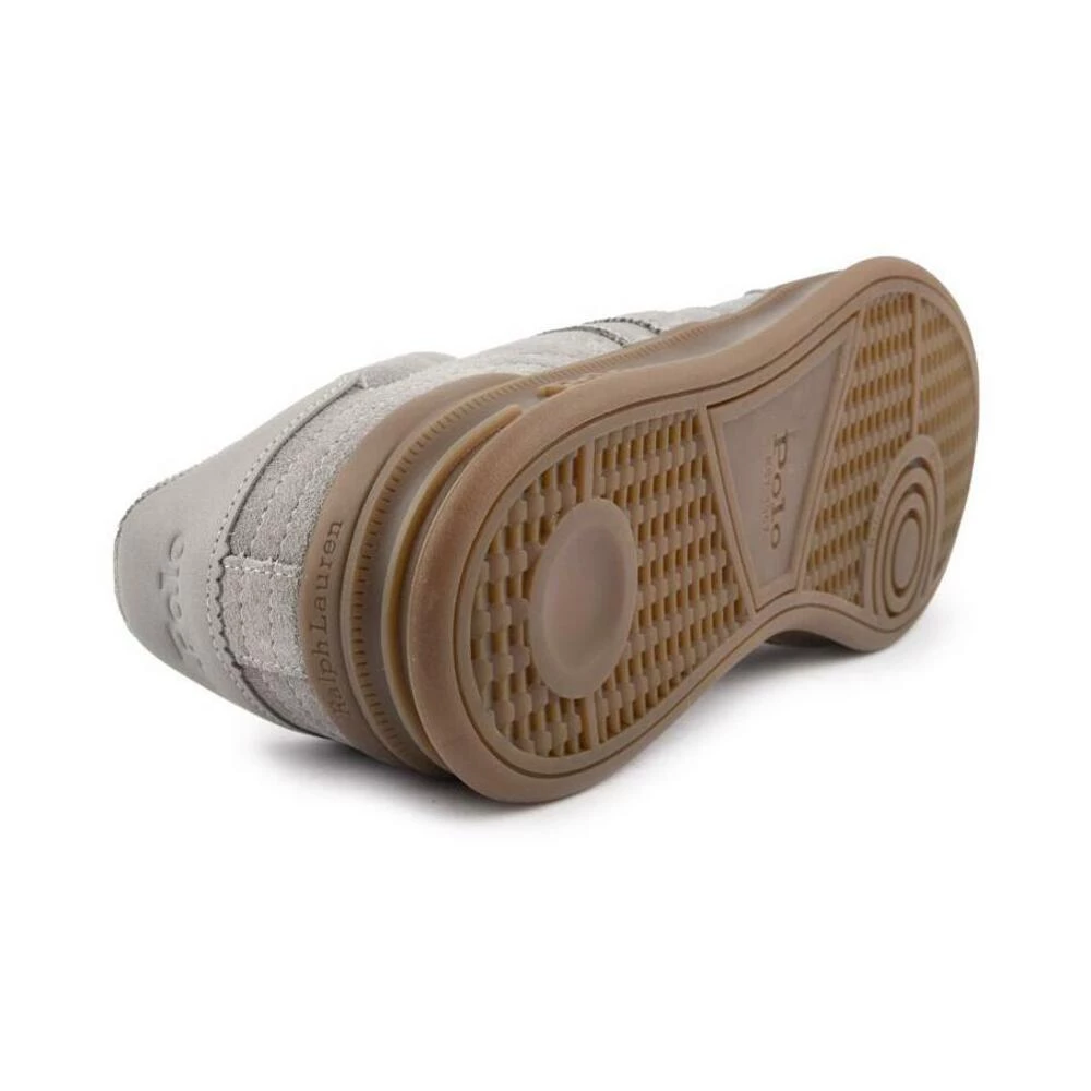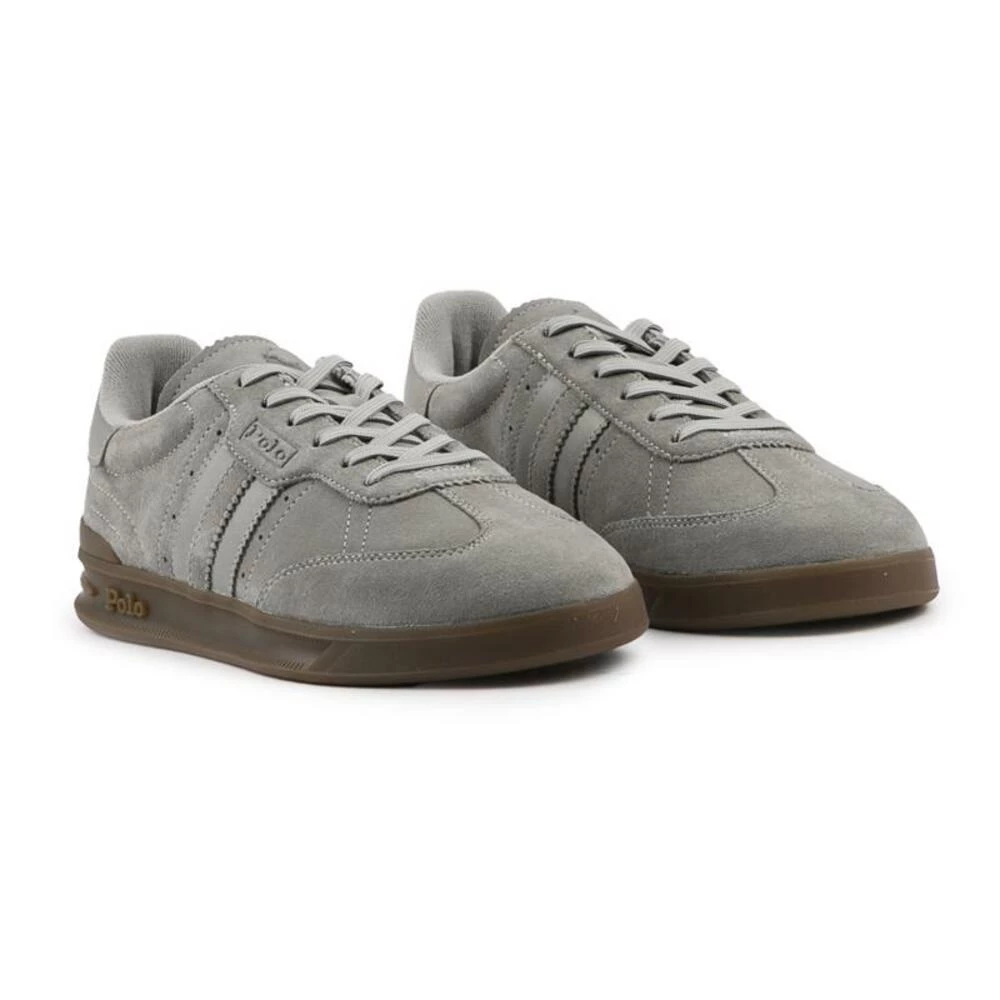 Mens grå polo ralph lauren aera stripe -trenere, produsert med skinn og en gummisåle. Med: Polo Heel and Quarter Branding, Polo Brands Sole, Polo Tongue Branding and Textile and Leather Fôr.