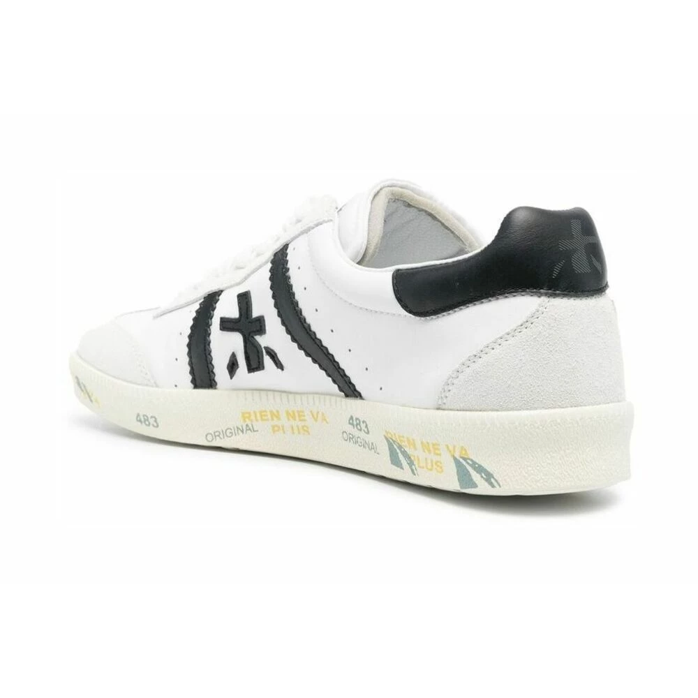 Premiata joggesko hvite bonnie low-top joggesko fra premiata med off-white, svart, kalveskinn, logo lapp til siden, logo-trykk tunge, rund tå, blonder foran festing, merkevaresåle og flat gummisåle.