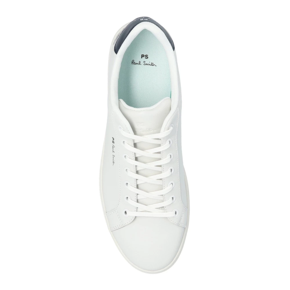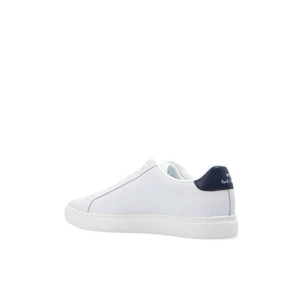 Hvite joggesko fra Paul Smith. Denne snøremodellen er laget av skinn, og sitter på en hvit gummisåle og viser frem en marineblå hælbenk og en preget svart logo og motiv av en sebra.