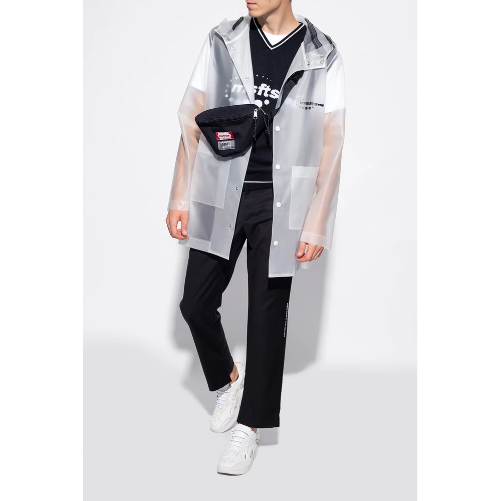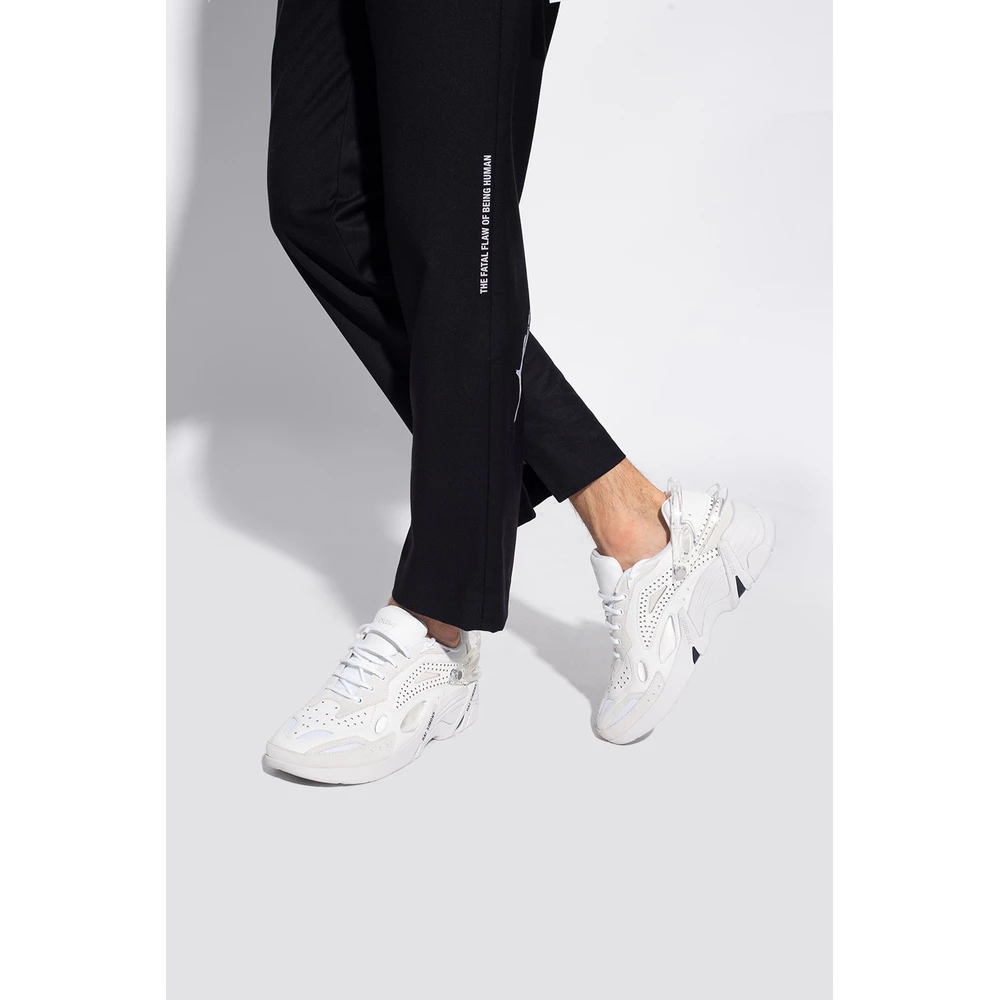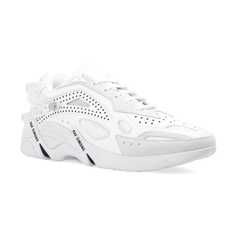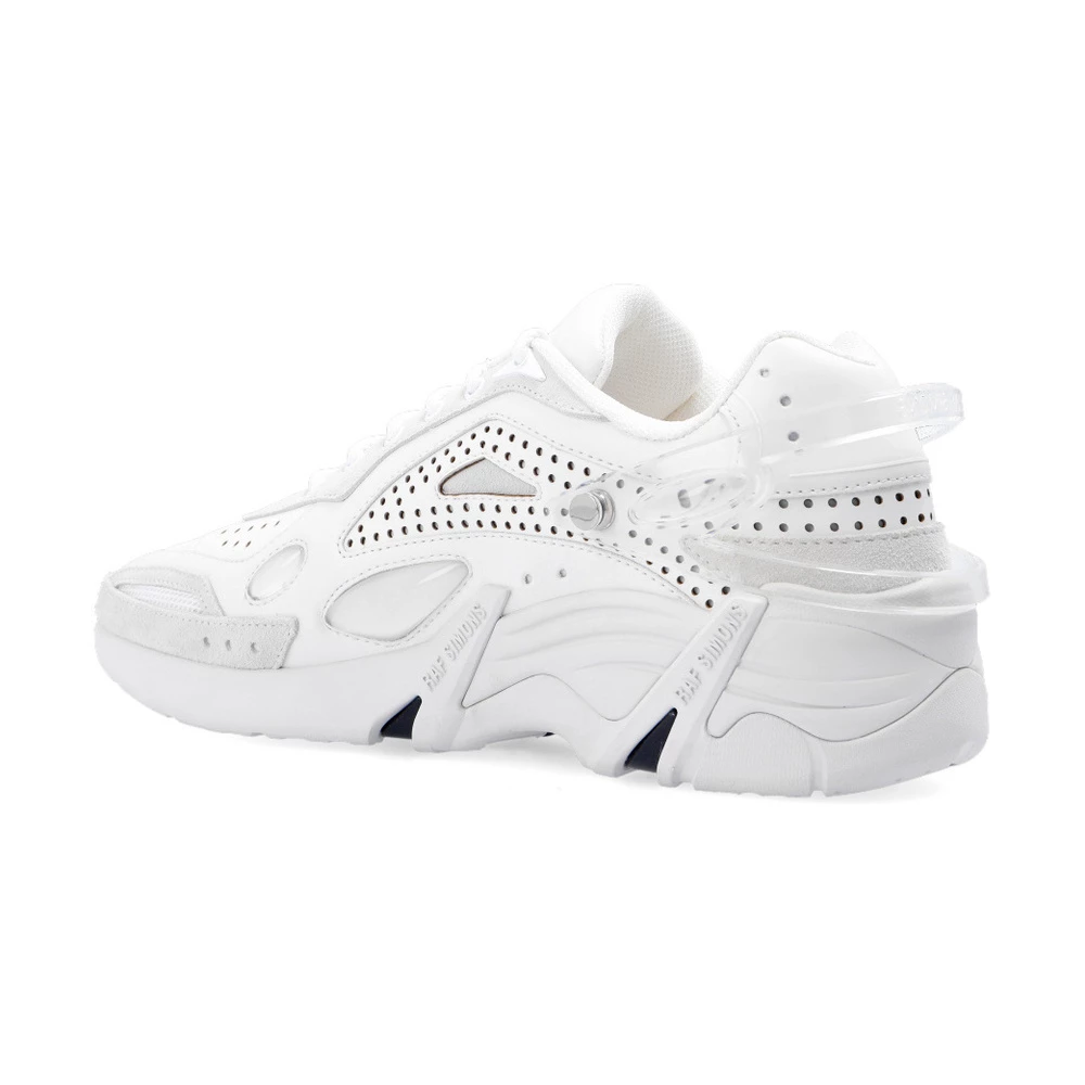 Hvit og lysegrå ‘Cylon-21’ joggesko fra Raf Simons. Denne blonderdesignet er laget av perforert skinn, og har gummitrimmer, en logotrykk, avtagbare oransje hælplater og en gummisåle i hvitt og svart.