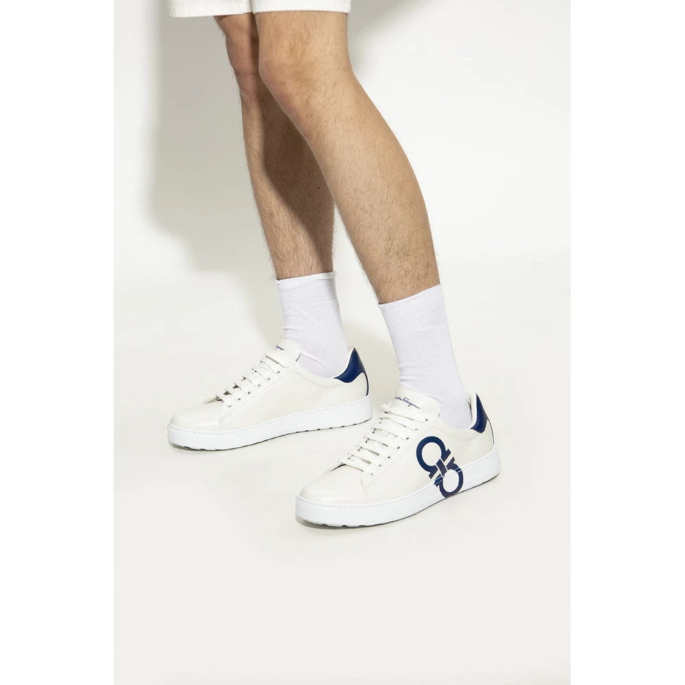 Hvite og marineblå ‘nummer’ joggesko fra Salvatore Ferragamo. Denne snøremodellen er laget av strukturert kalveskinn, og sitter på en hvit gummisåle og viser frem en trykt logo og merkets signatur Gancini-motiv.