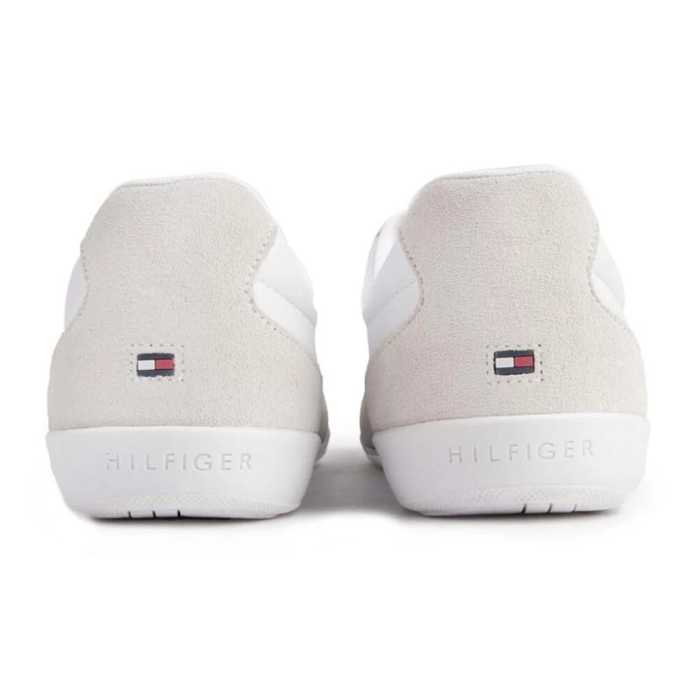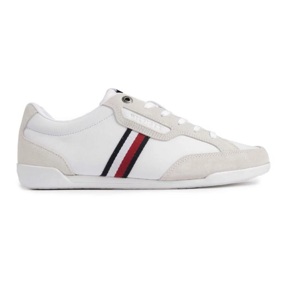 Mens White Tommy Hilfiger Core Corporate Leather Trainers, produsert med skinn og en gummisÄle. Med: Vevd sidemerking, trykt innsokk, gravert topp eyelet, merkevarebygging til tunge og korportat sÄle stripe.