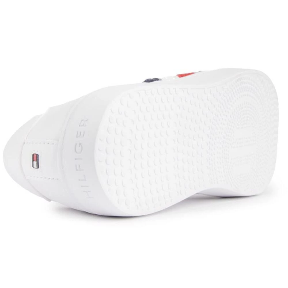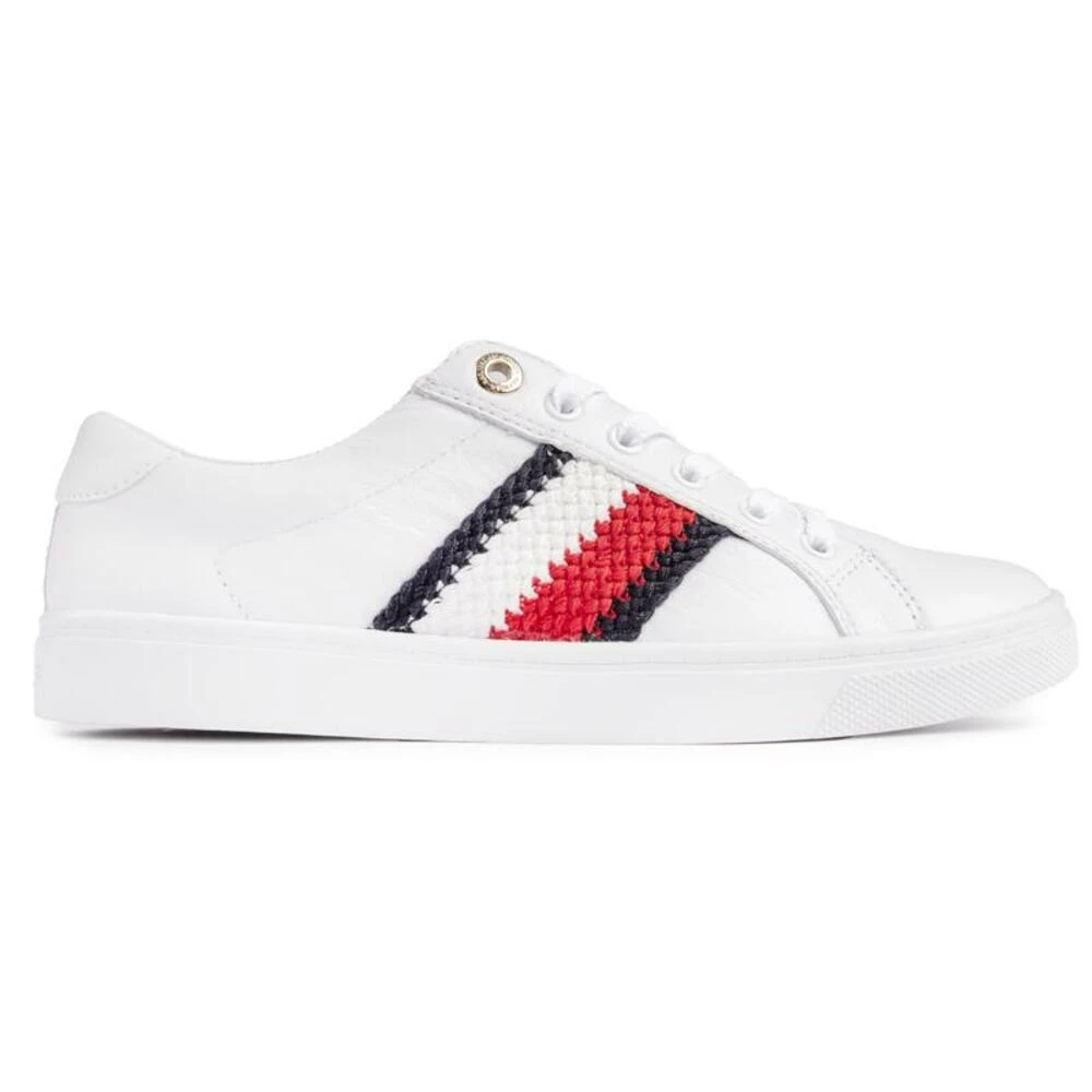 Womens White Tommy Hilfiger Corporate Cupsole Trainers, produsert med skinn og en gummisåle. Med: strikket merkevarebygging, trykt innsokk, vulcanisert såle, gullklær og mykt skinn.
