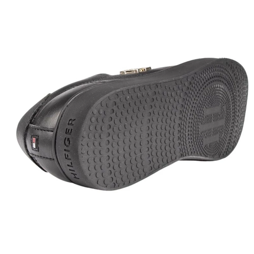 Womens Black Tommy Hilfiger Maskinvarelogo Cupsole Trainers, produsert med tekstil og en gummisÄle. Med: gulldetaljer, merkevarebygging til tungen og hÊlen, tekstilforet og sokken, lett og polstret skuminnersÄle.