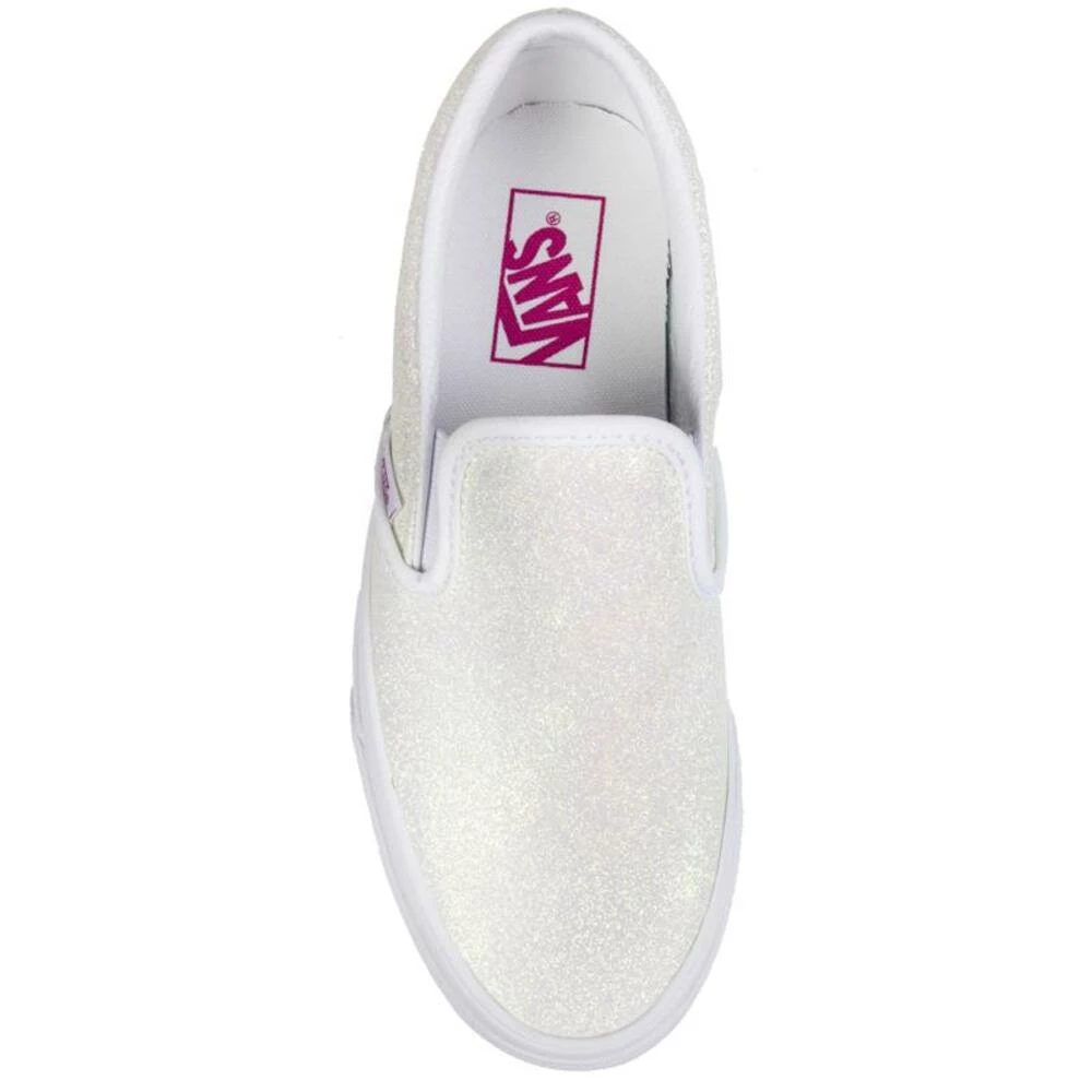 Domens hvite varebiler glir på trenere, produsert med tekstil og en gummisåle. Med: glitter øvre detaljer, lerretfor og sokk og vulkanisert yttersåle.