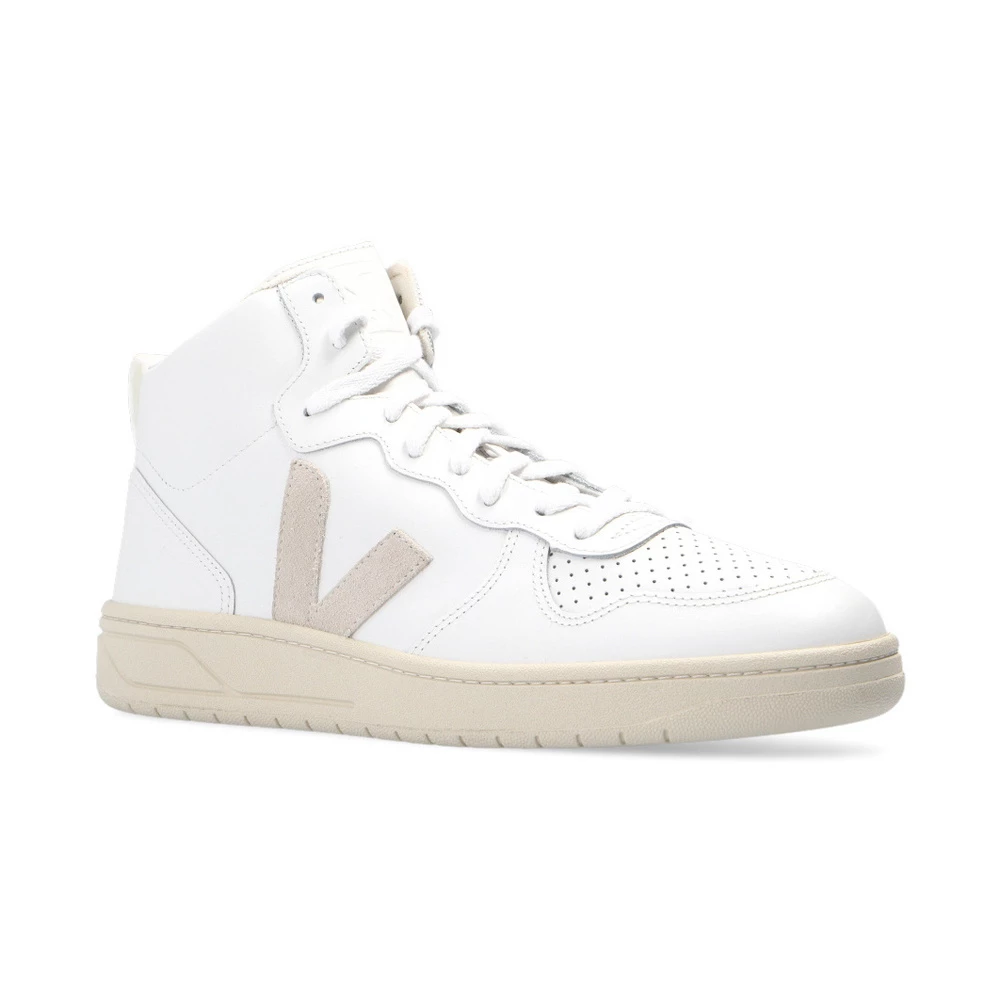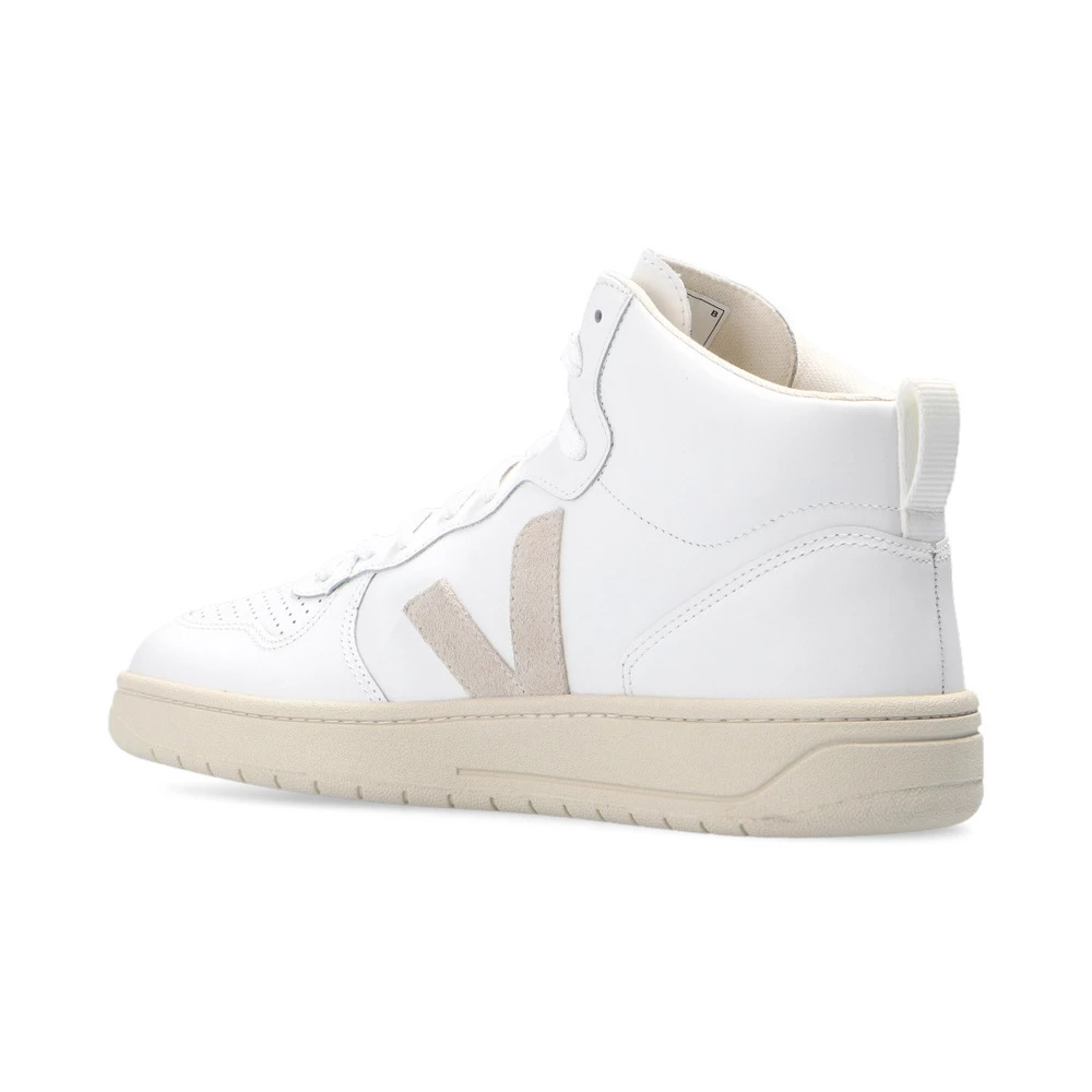 Hvite V-15 High-top sneakers med snøre i lær fra Veja. Dette snøreparet er laget av lær og sitter på en kremgummisåle laget av organiske og resirkulerte materialer og er beriket med en logo preget på pløsen, perforeringer, organiske bomullslisser og en beige logolapp laget av semsket skinn. Mesh-innerfôret laget av resirkulerte materialer ble utviklet for å oppnå bedre motstand mot friksjon. Den organiske og resirkulerte innersålen er laget av sukkerrør, Amazon-gummi, organisk bomull og resirkulert EVA-skum. Læret kommer fra gårder i Rio Grande do Sul og er LWG Gold-sertifisert av Leather Working Group, som fremmer bærekraftig praksis som har en positiv innvirkning på miljøet i garverier. Materiale: Overdel: Lær Såle: Sukkerrør, Amazon-gummi, Resirkulert EVA-skum Produktstil-ID: VQ021270B