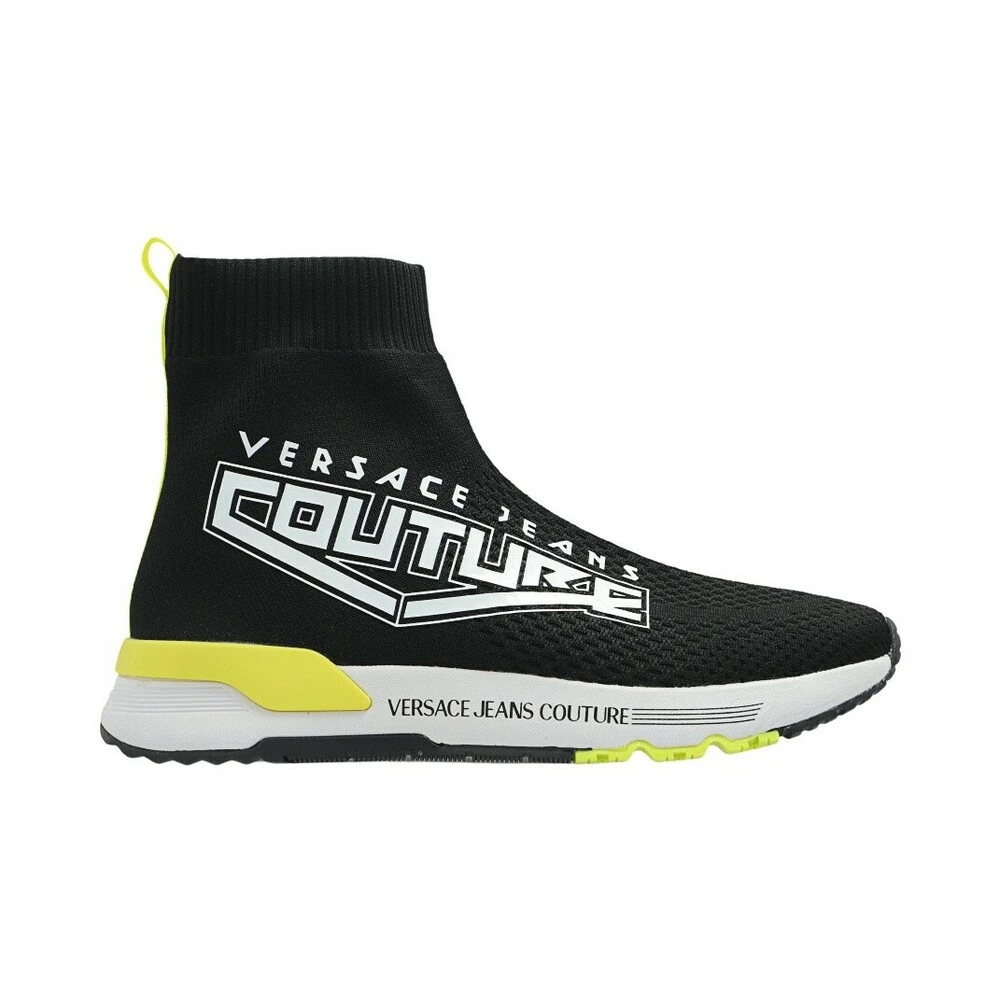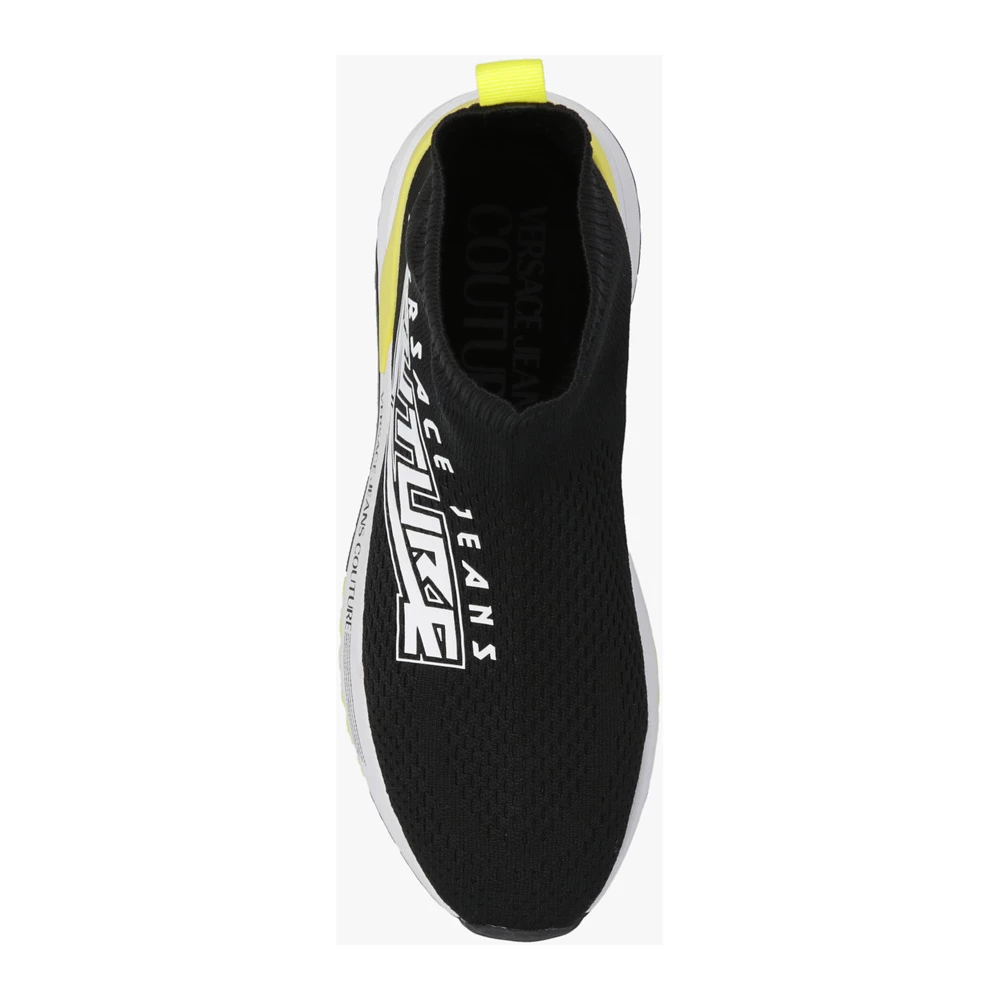 Svarte og gule slip-on joggesko fra Versace Jeans Couture. Dette paret hviler pÄ en svart og grÞnn gummisÄle, og er dekorert med et hvitt og svart logo -trykk og ribbet kant.