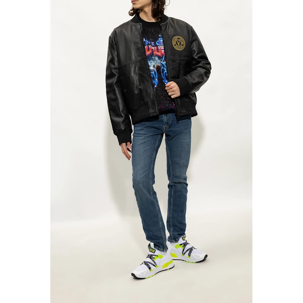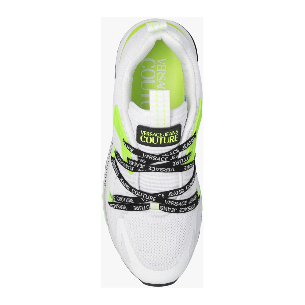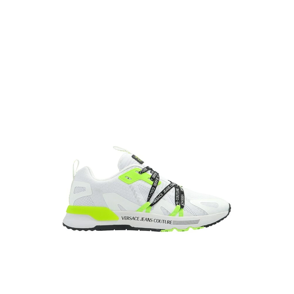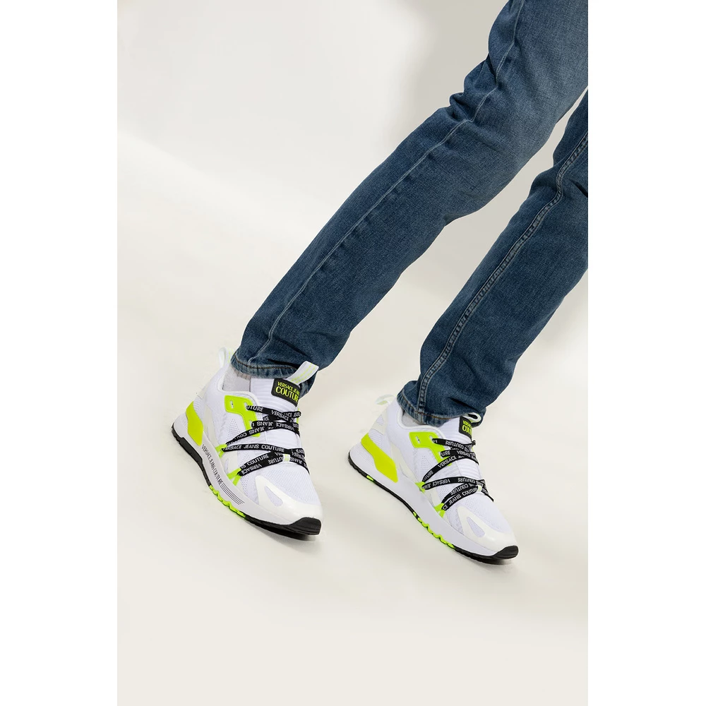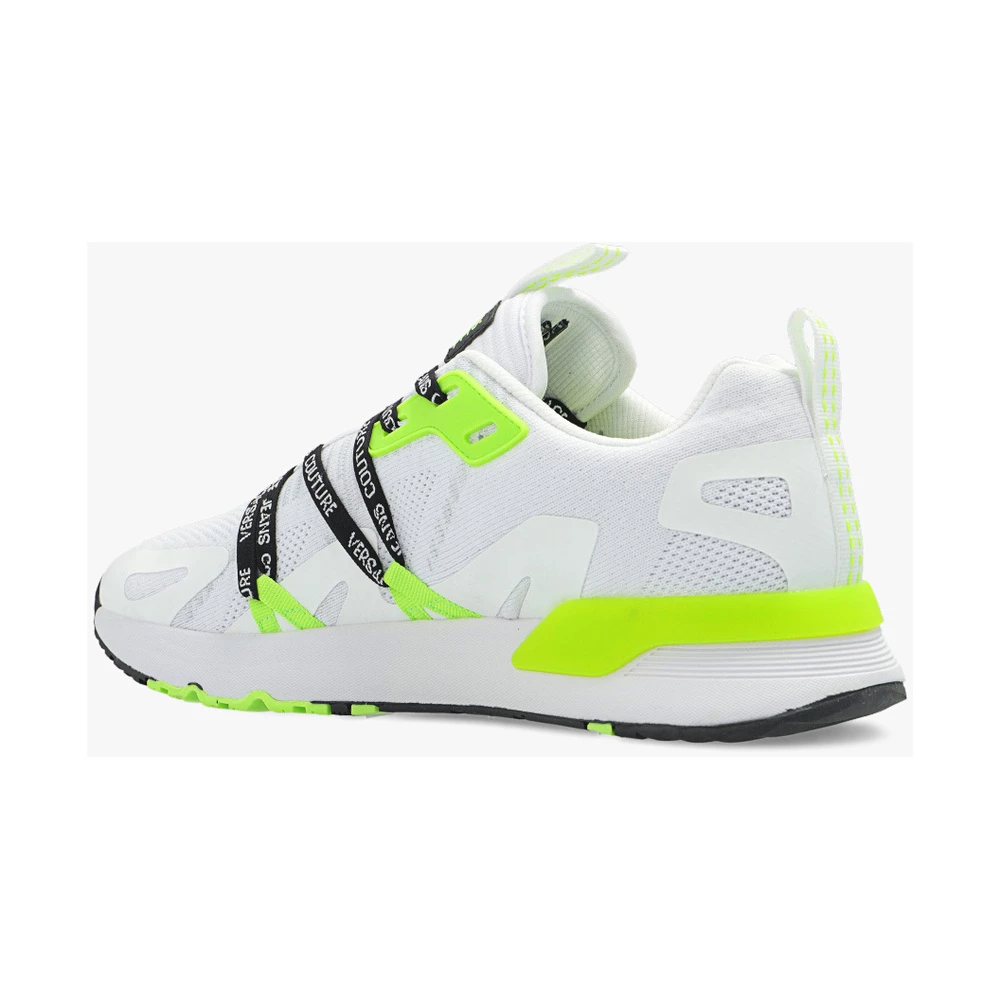 Hvite, grønne og svarte joggesko fra Versace Jeans Couture. Dette blonderparet hviler i en grønn og svart gummisåle, og har utskrifter, perforeringer og et logo-mønster.