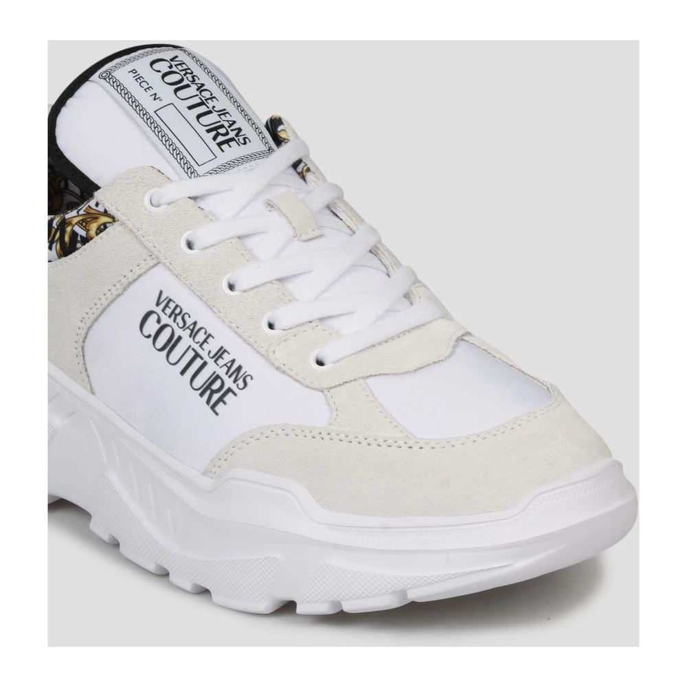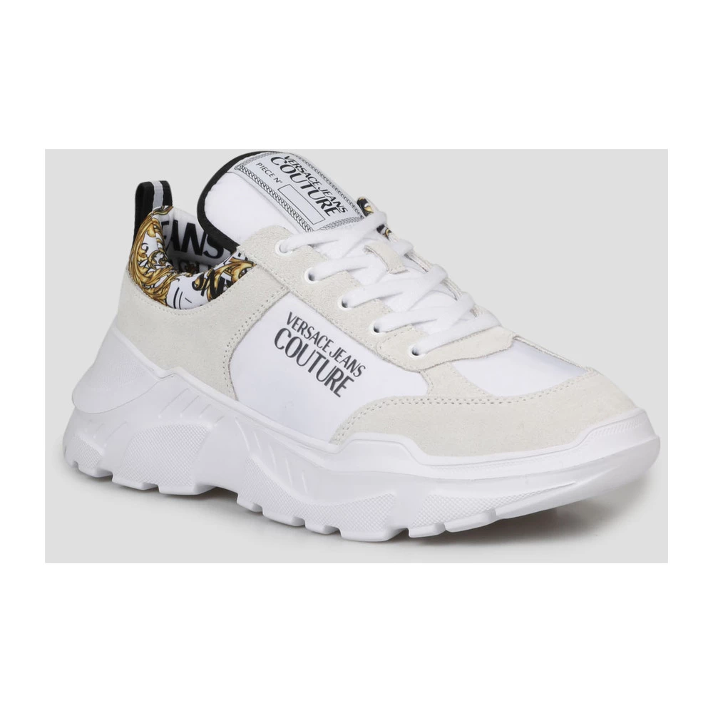 Tilgjengelig Only Versace Jeans joggesko, i nylon og semsket skinn med logo couture detaljer. – FW22 – Round Toe – Lace Up – `Piece Number` Label On the Front Tongue – Logo Print On the Outside – Rubber Sole – Made in China – 51% Calf Leather, 49% Polyester