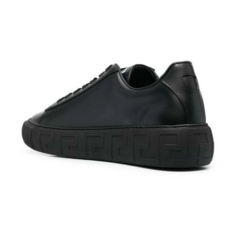 Versace joggesko svart-hvitt skinn logo-trykte joggesko fra Versace med logo-trykk til siden, logo-lapp på tungen, signatur gres detaljering, rund tå, frontfjæring foran, merkevaresåle og flat gummisåle. Størrelse IT Designer ID: DSU8404 DV51G D4101