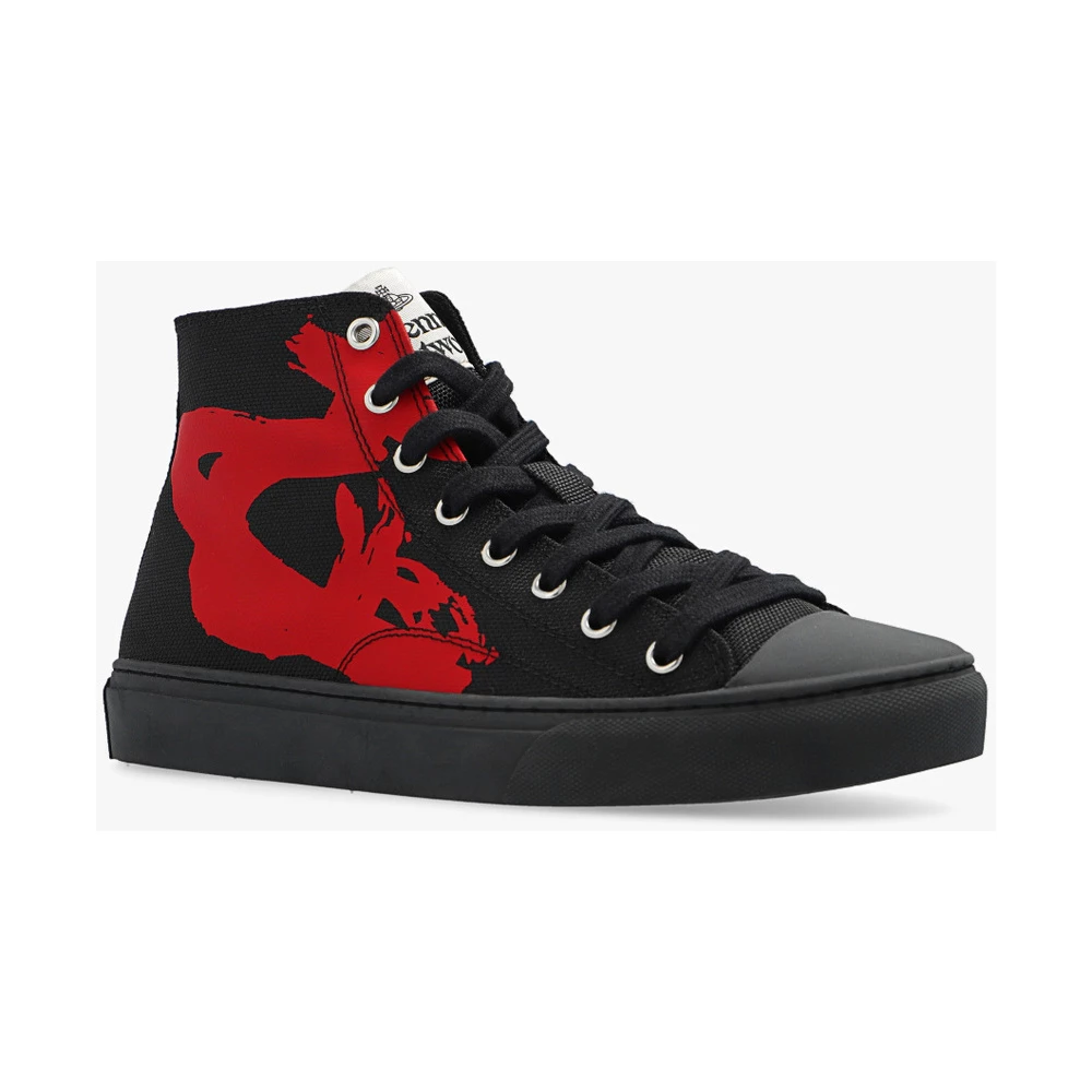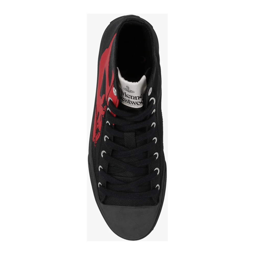 Svarte høye top joggesko fra Vivienne Westwood. Denne snøremodellen er laget av resirkulert materiale, og sitter på en svart gummisåle og har en tunge lapp og en trykt rød logo på siden.
