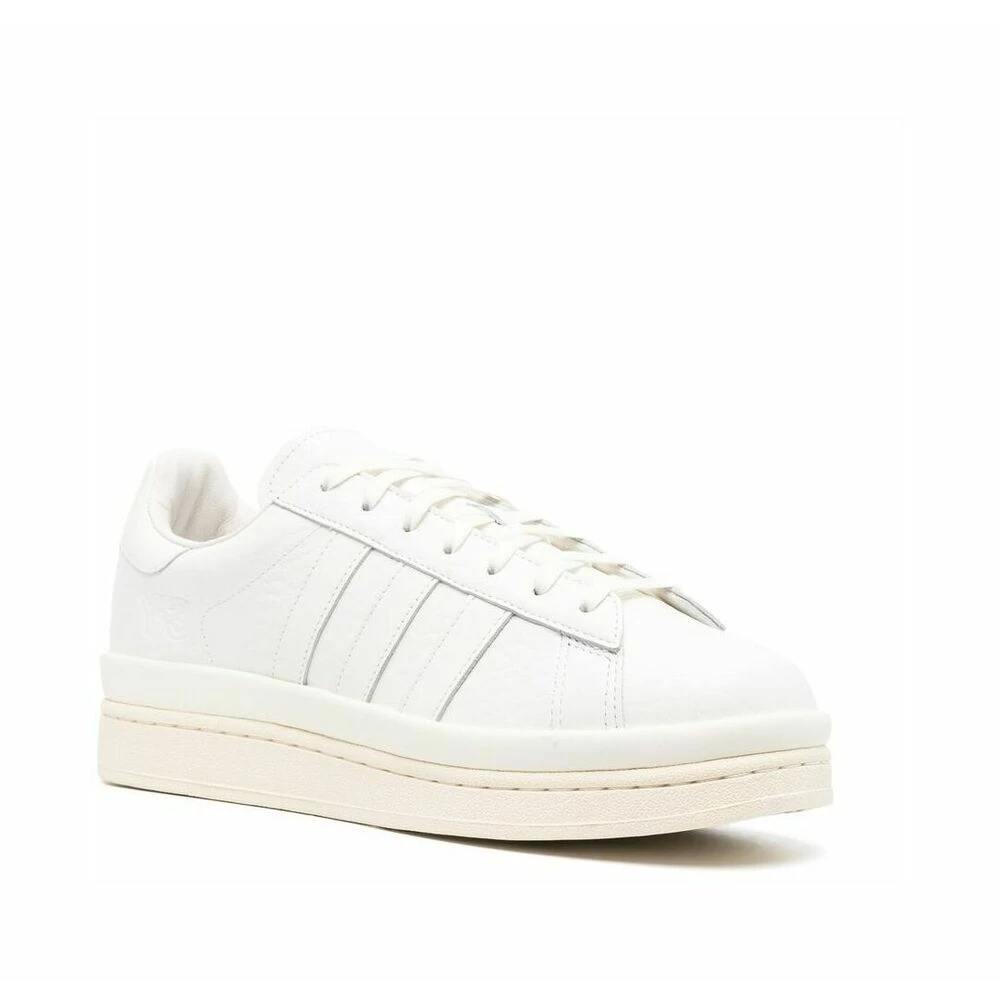 Y-3 joggesko hvite hicho low-top joggesko fra y-3 med hvitt, kalveskinn, sidestripedetaljer, preget logo til siden, rund tå, flat gummisåle og frontfjæring foran.